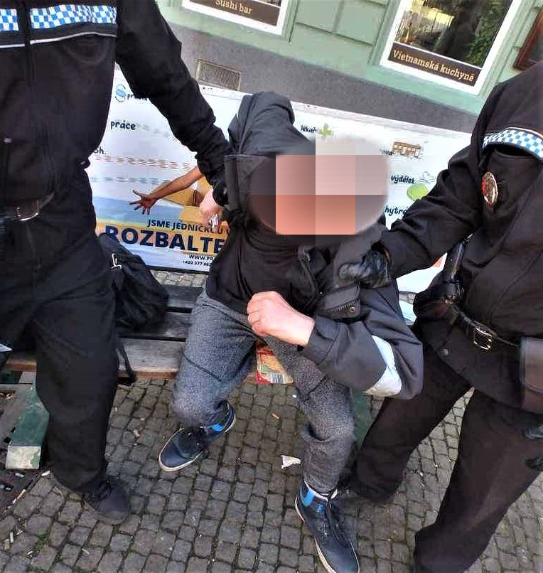 Zásah strážníků městské policie na Americké třídě proti muži bez roušky