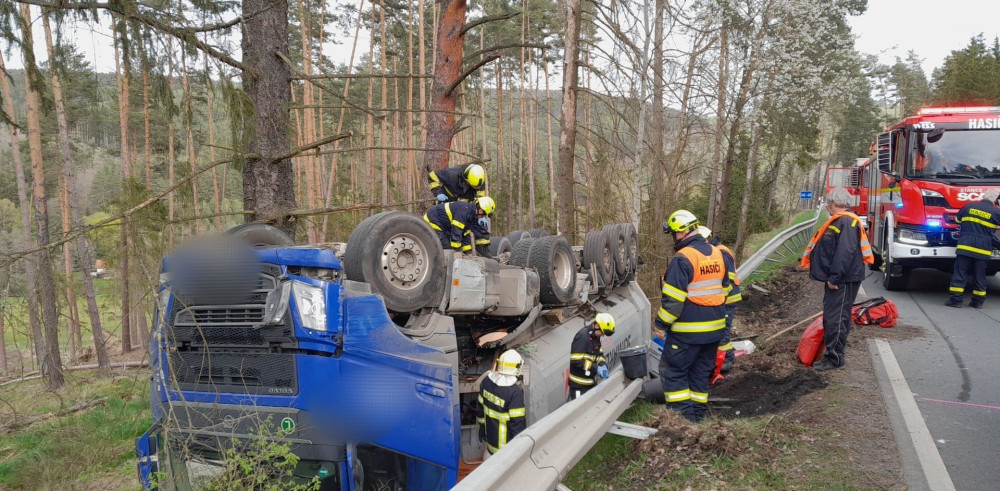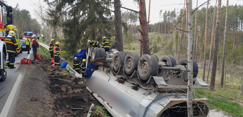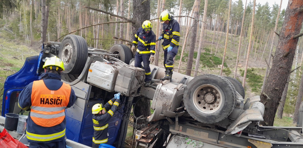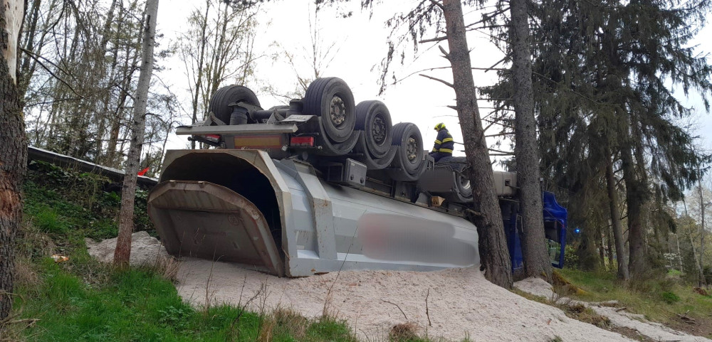 Náklaďák s pískem skončil na střeše a řidič v nemocnici, zranění utrpěla i žena, jejíž auto rozmáčkl spadlý strom