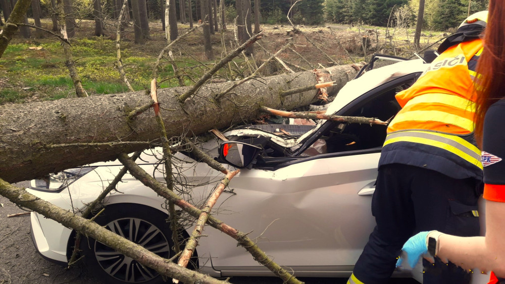 VIDEO: Na jedoucí auto spadl strom. Ze zdemolovaného vozu vyprošťovali hasiči těžce zraněnou ženu
