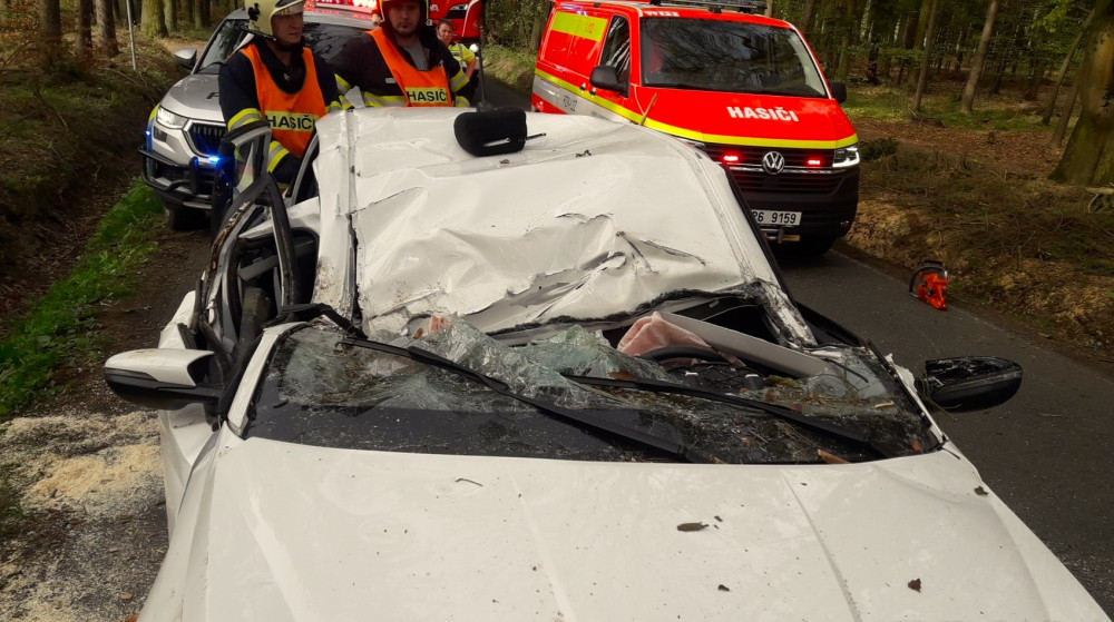 Na projíždějící automobil spadl strom. Ze zdemolovaného vozu vyprošťovali hasiči těžce zraněnou ženu