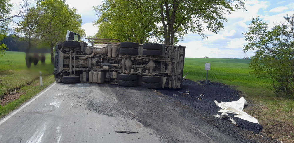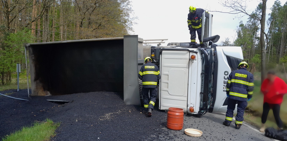 Řidička převrátila náklaďák a vysypala na silnici asfalt, při další nehodě se střetl traktor, dodávka a náklaďák