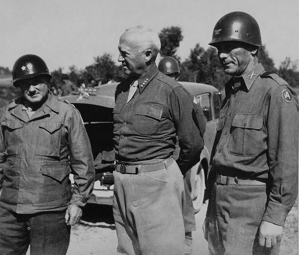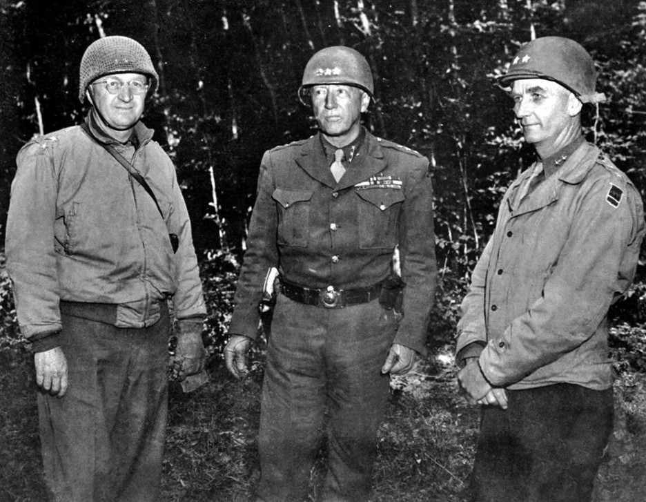 Generál Patton s generály 3. armády. Vlevo gen. Eddy, velitel XII.sboru, vpravo gen. Mc Bride velitel XX. Sboru