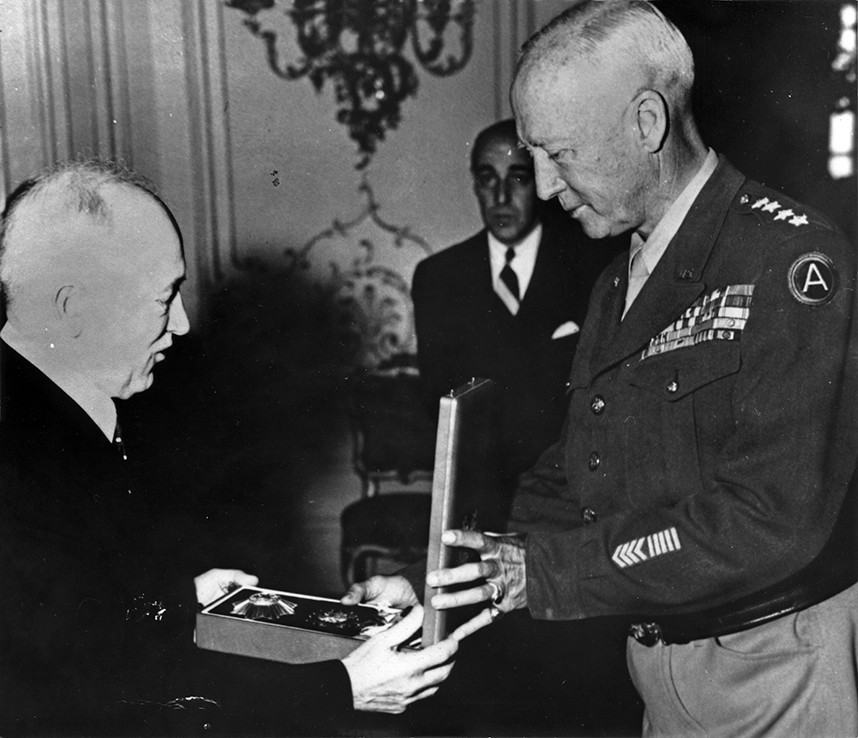 Pražský hrad. Prezident Beneše vyznamenává slavného generála řádem Bílého lva I. třídy