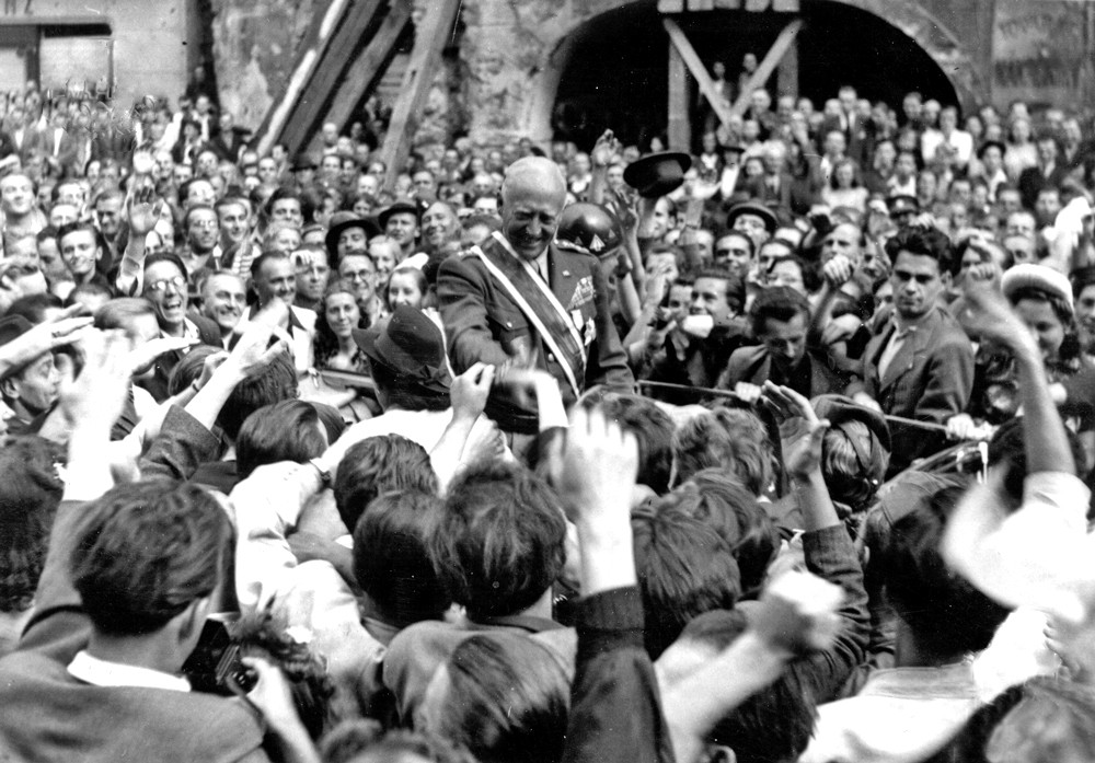Staroměstské náměstí v Praze vítá bouřlivě gen. Pattona s Bílým lvem