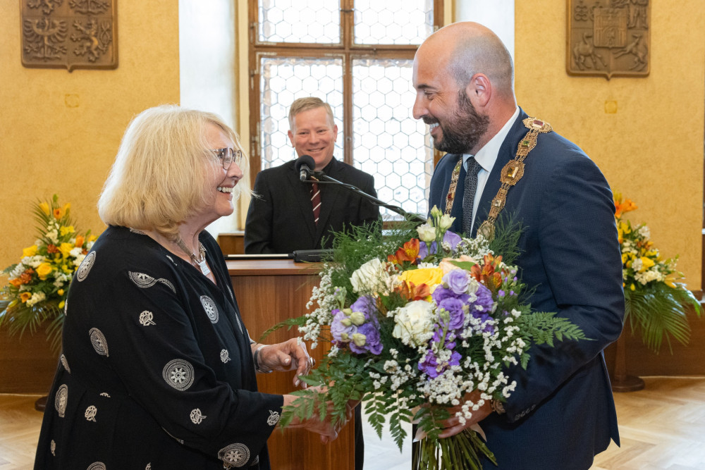 Lída Rakušanová byla legendárním hlasem Svobodné Evropy, teď převzala v Plzni Cenu 1. června. Cenu jí předal primátor Plzně Roman Zarzycký