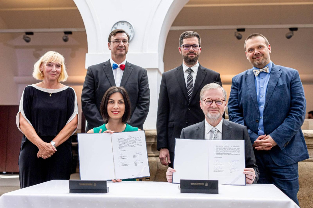 Koaliční smlouvu stvrdili podpisem i celostátní předsedové stran Petr Fiala a Markéta Pekarová Adamová. Lídr kandidátky Jan Šašek stojí jako druhý zprava vedle ministra Martina Baxy