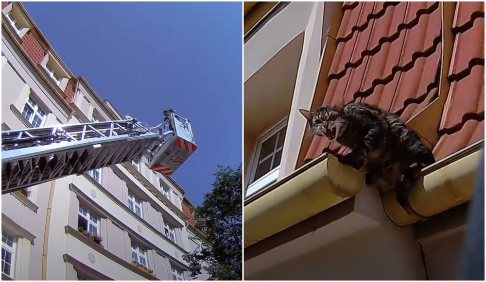 VIDEO: Kocour Jerry uvízl na střeše, hasiči pro něj vyrazili se žebříkem, nahoru do koše vzali i majitelku