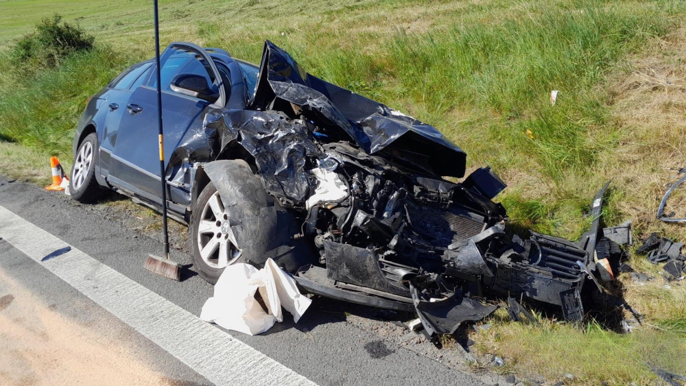 Svědci nehody bleskově zlikvidovali svými hasičáky požár auta, které hořelo po drtivém střetu s jiným vozem