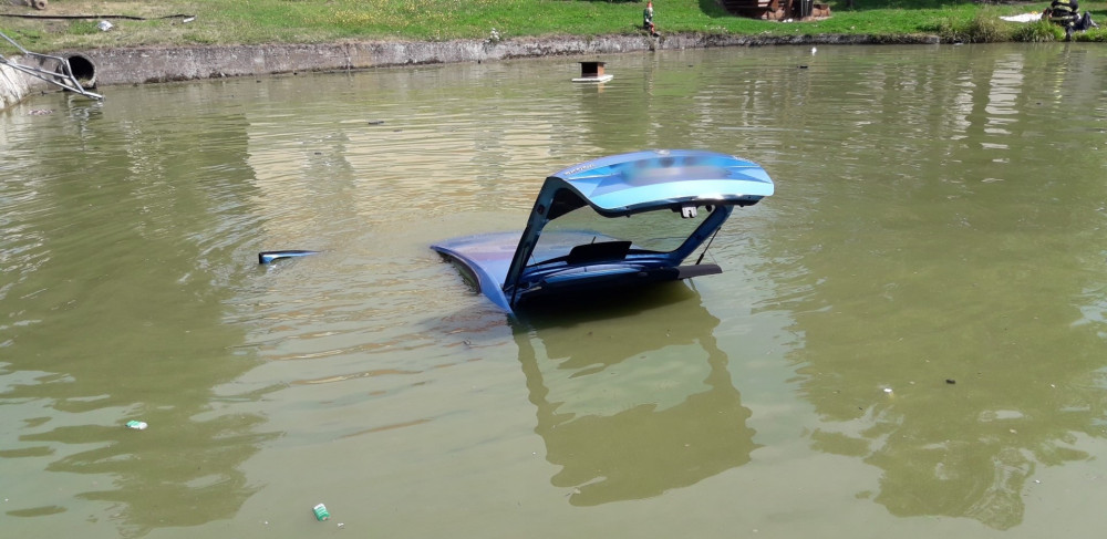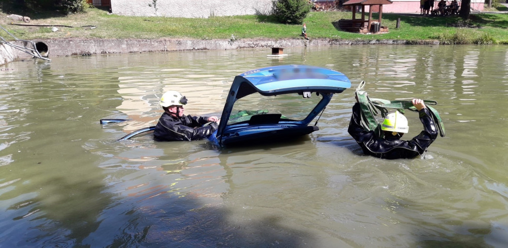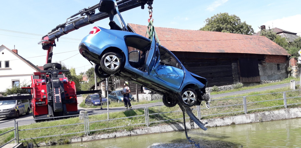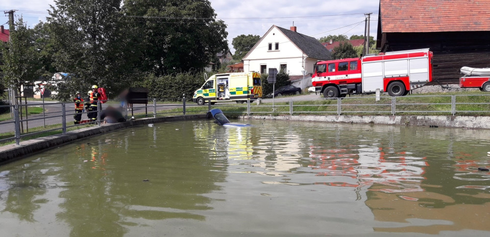 Starší řidič dostal smyk a skončil v požární nádrži, topící se posádce pomohli svědci