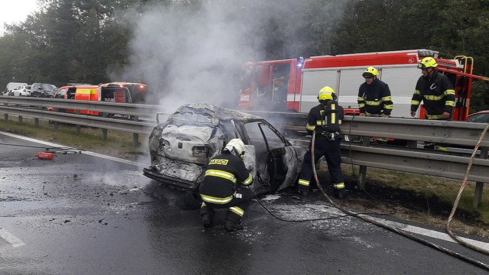 V hořícím osobáku zahynula jedna osoba po střetu s kamionem na dálnici D5. Spolujezdkyně utrpěla těžké popáleniny