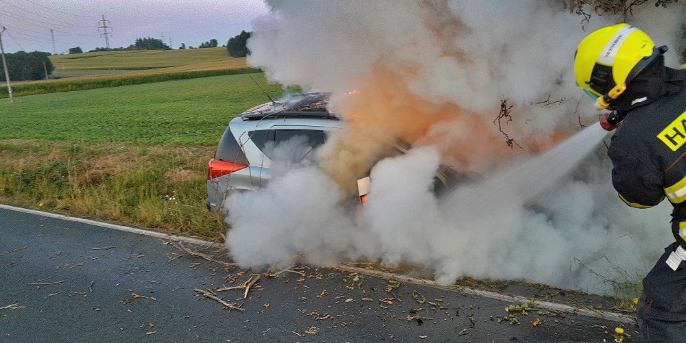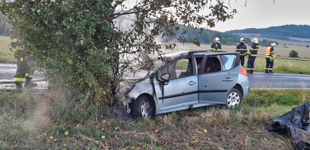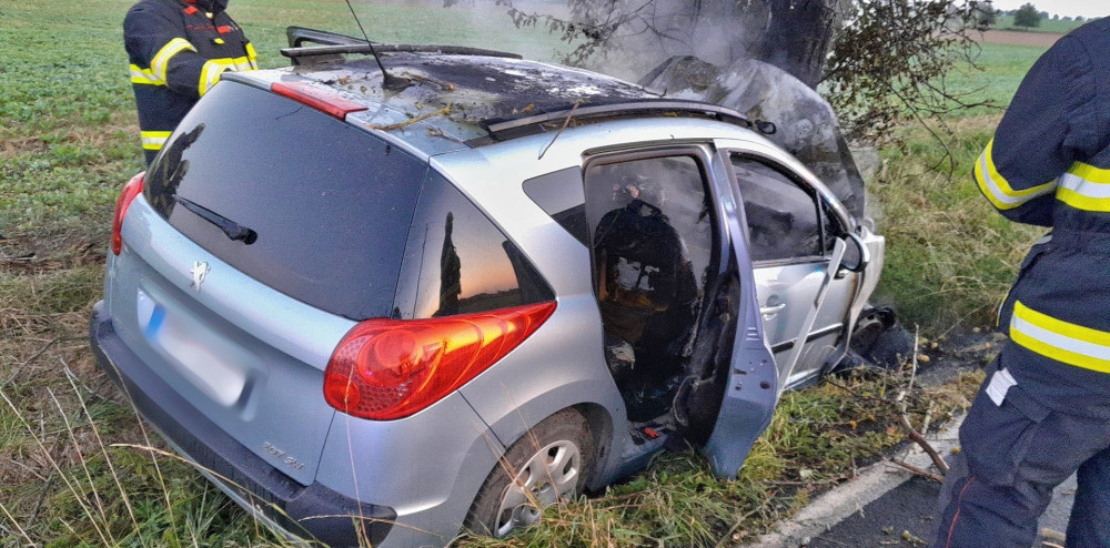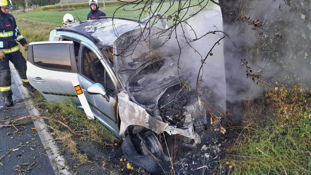 Osobák vylétl ze silnice, narazil do stromu a začal hořet, řidič skončil v nemocnici