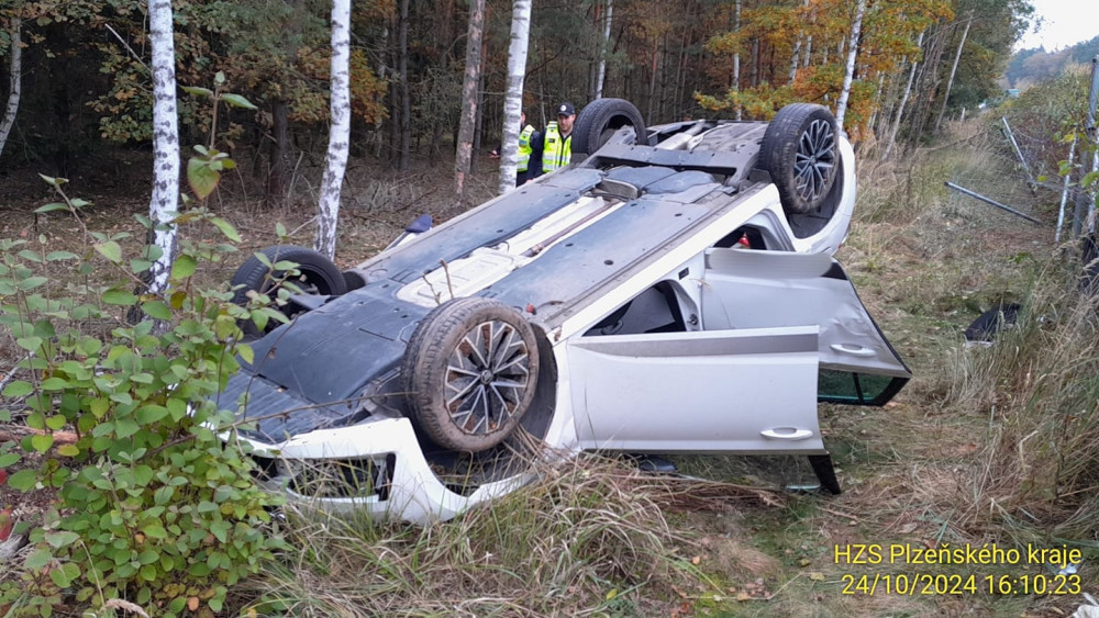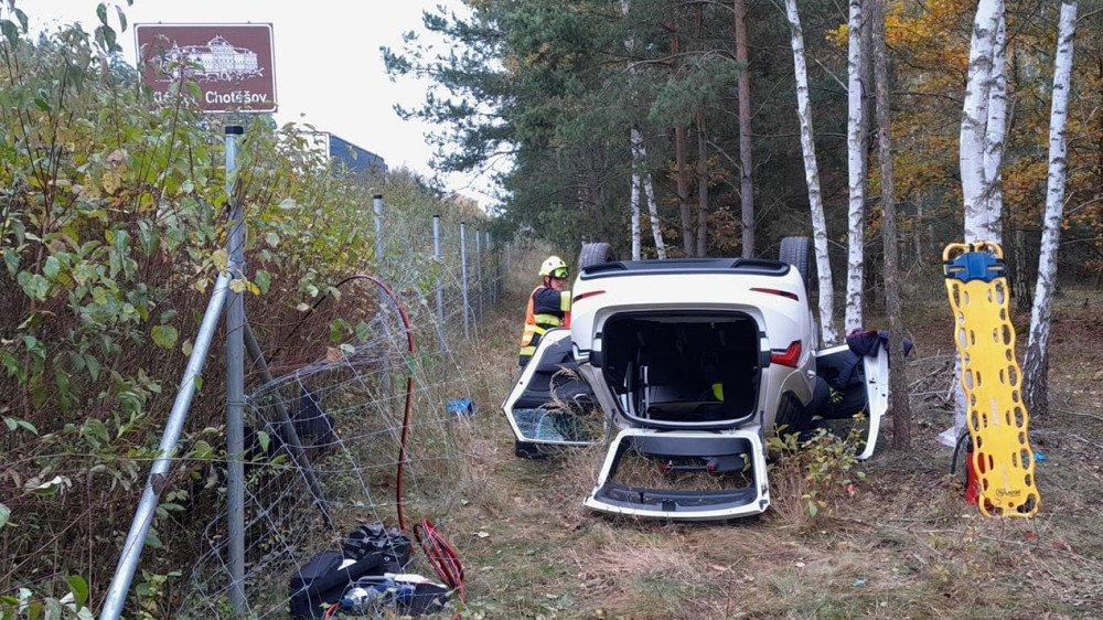 Osobák po střetu s náklaďákem vyletěl z dálnice, prorazil plot a skončil na střeše. Řidič je těžce zraněný
