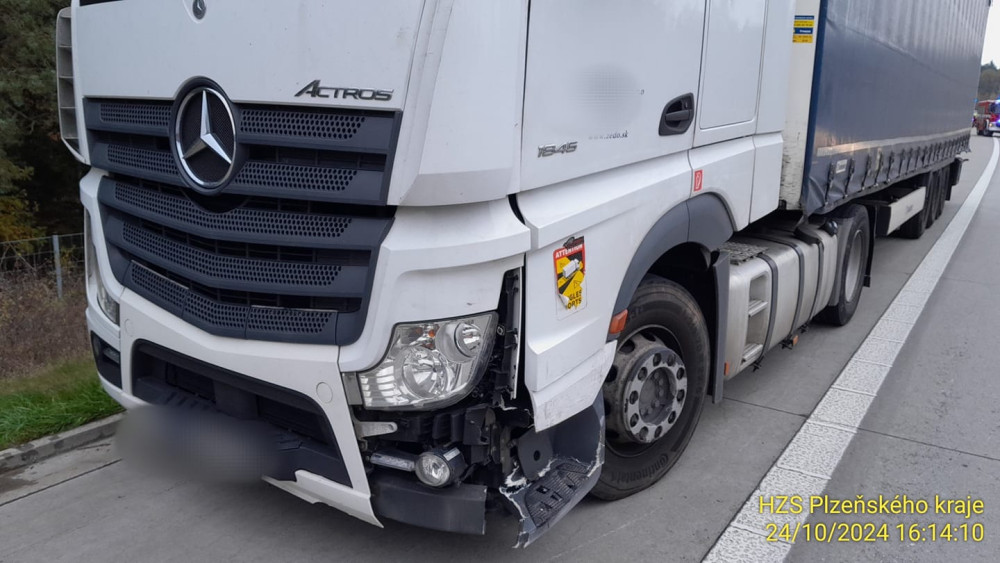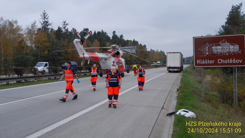 Osobák po střetu s náklaďákem vyletěl z dálnice, prorazil ochranný plot a skončil na střeše. Řidič je těžce zraněný