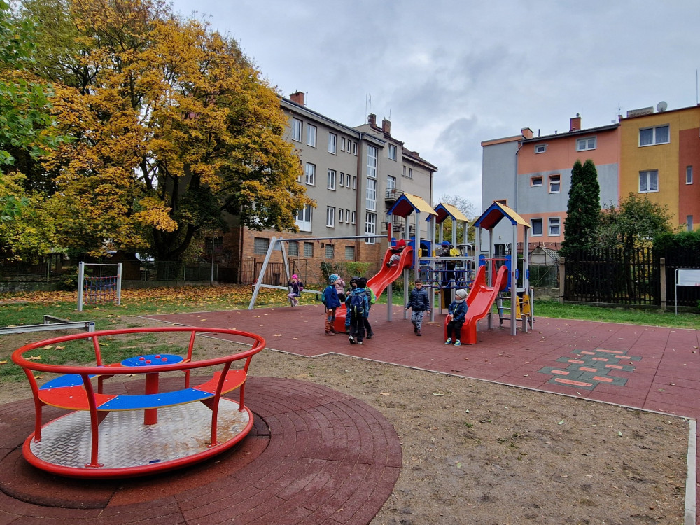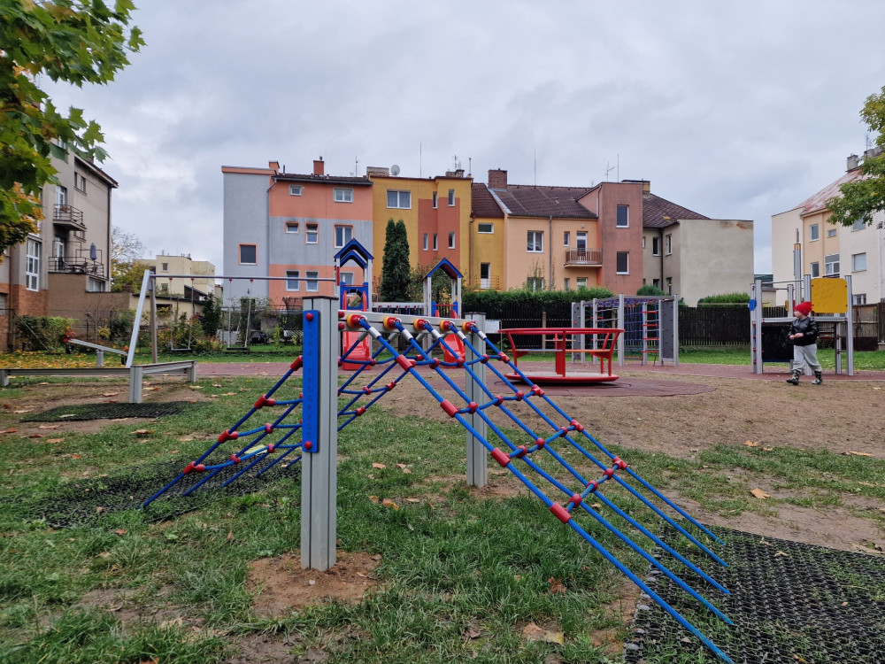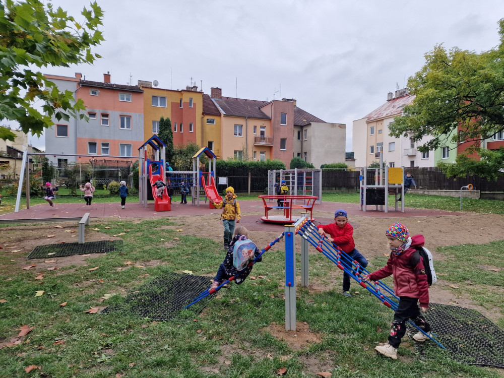 Slovanské děti se radují z proměny hřiště ve vnitrobloku za jídelnou U Koně