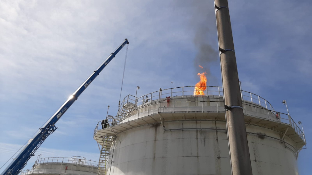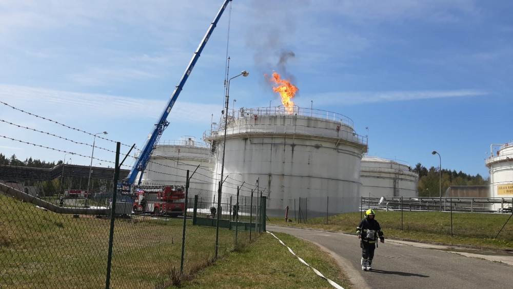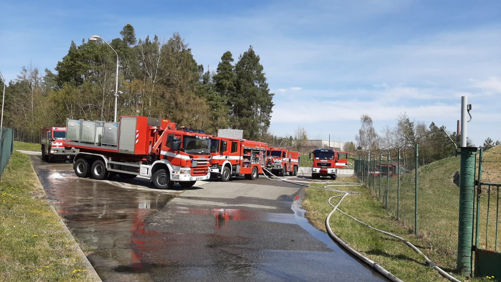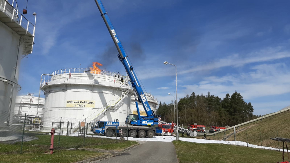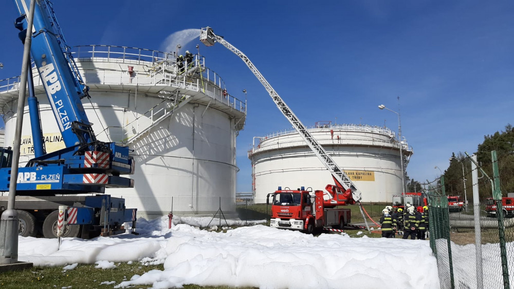 Patnáct jednotek hasičů likvidovalo požár obří nádrže s benzínem v firmě Čepro