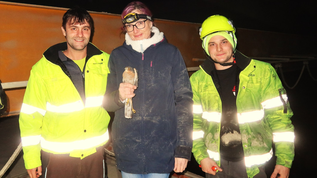 Krahujec vletěl při pronásledování kořisti do obří haly plné velkých strojů. Vysvobodili ho experti při noční akci