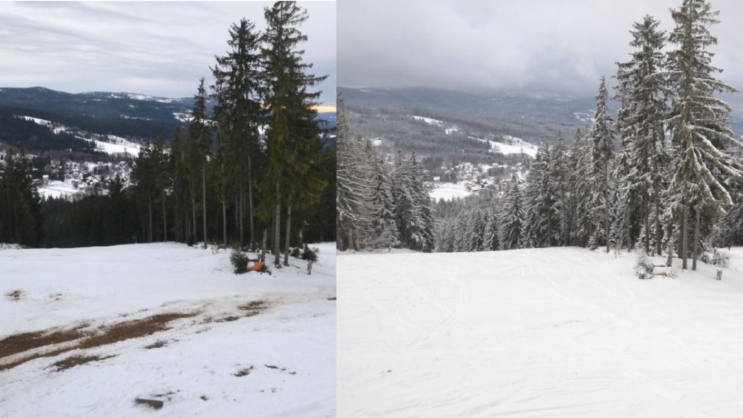 Tyto dva snímky ze sjezdovky šumavského Špičáku dělí od sebe 24 hodin