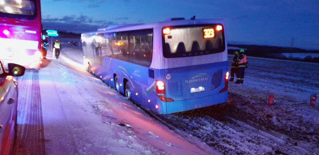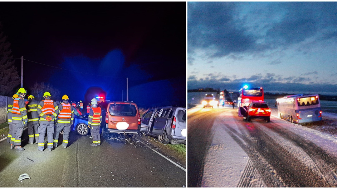 Nehoda tří osobáků si vyžádala celkem čtyři zraněné. Kluzká vozovka potrápila i řidiče autobusu