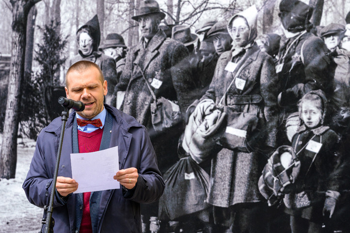 Primátor Plzně Martin Baxa četl jména obětí holocaustu před fotografií plzeňských Židů připravených k prvnímu transportu