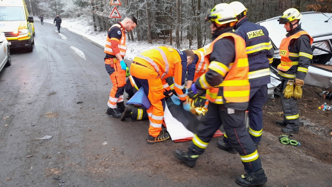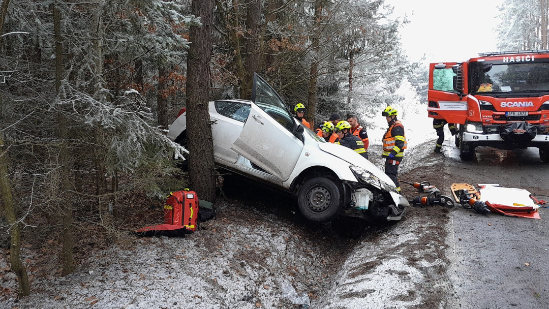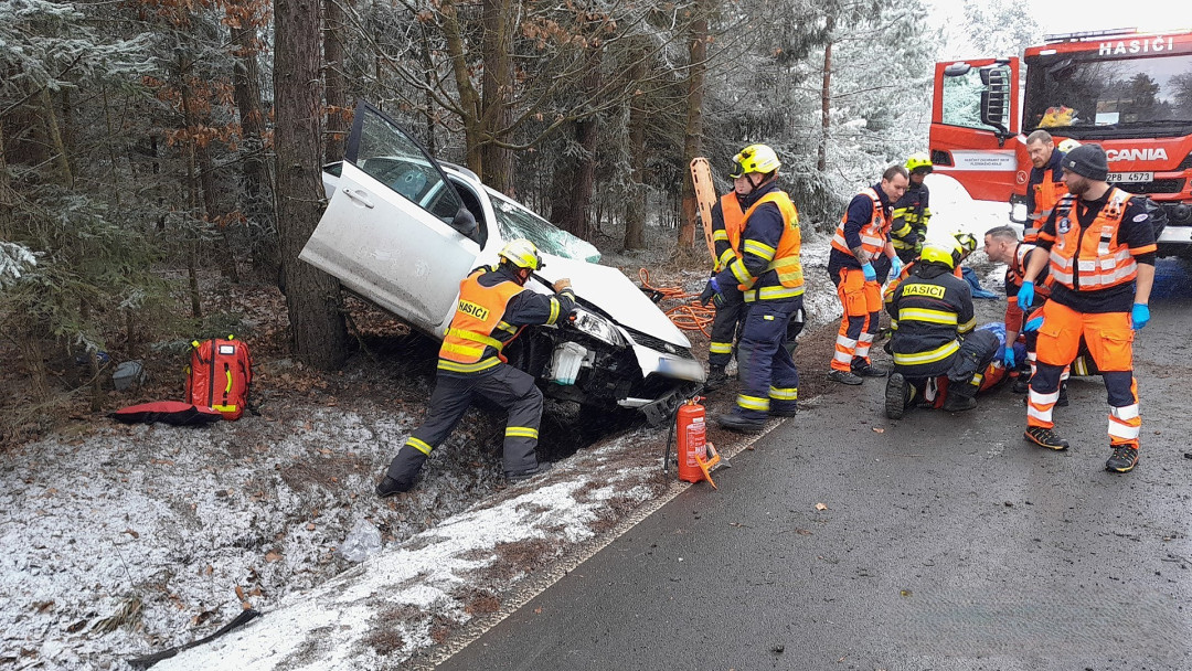 Ženu a malé dítě museli hasiči vyprostit z havarovaného auta, řidička dostala smyk a narazila čtyř stromů