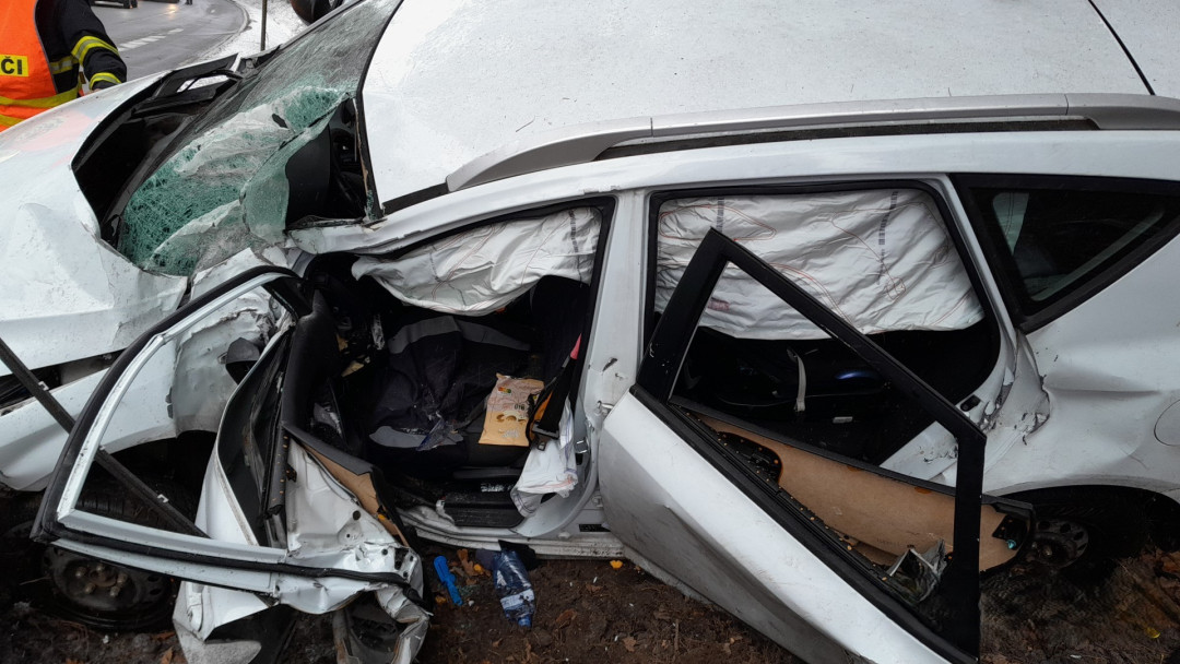 Ženu a malé dítě museli hasiči vyprostit z havarovaného auta, řidička dostala smyk a narazila čtyř stromů