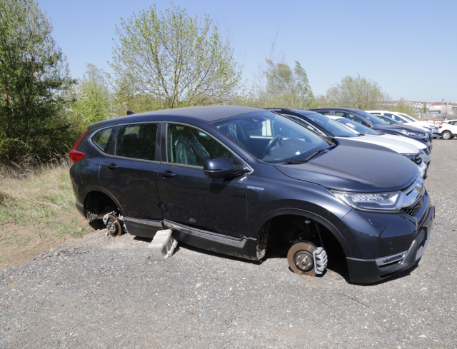 Zloděj ukradl kola ze dvou nových aut, nechal je stát na "špalcích" ze kterých spadla