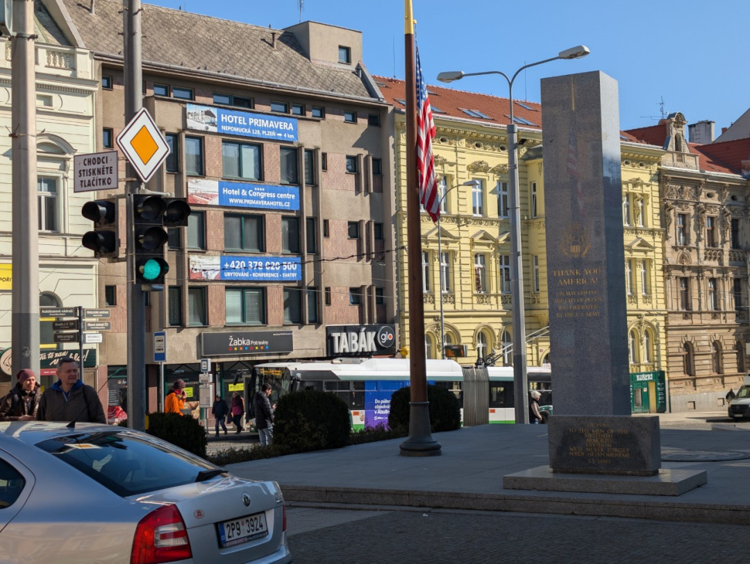 Snad z žádné strany si pomník Díky, Ameriko nevyfotíte, aniž by na pozadí byla nějaká nevkusná reklama.