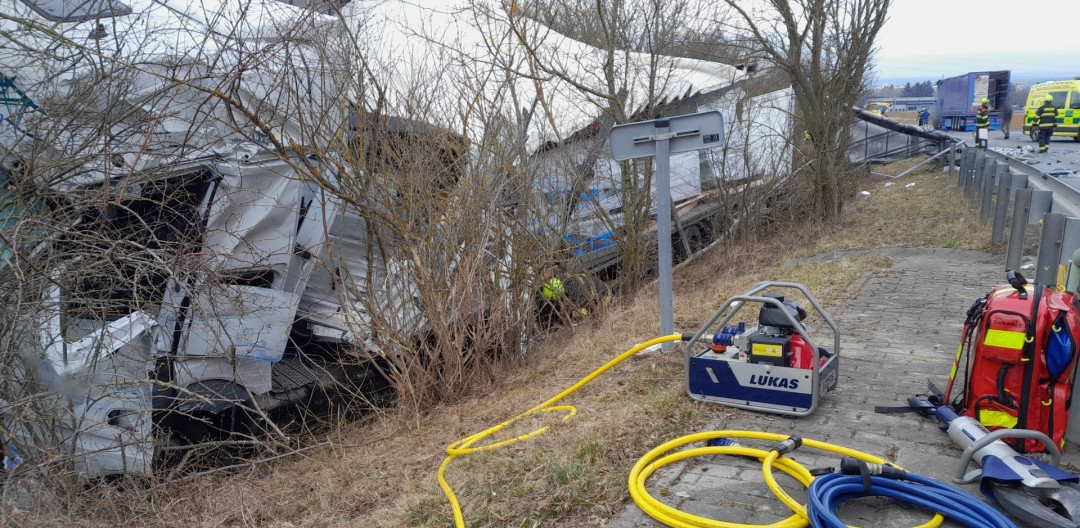 Vážná dopravní nehoda dvou kamionů, jeden z náklaďáků odmrštil náraz mimo vozovku