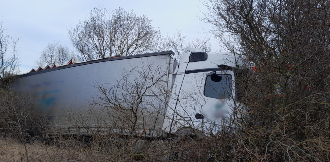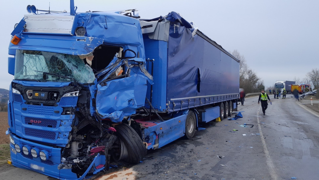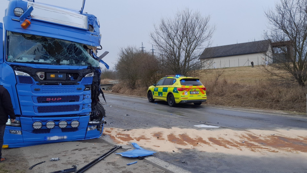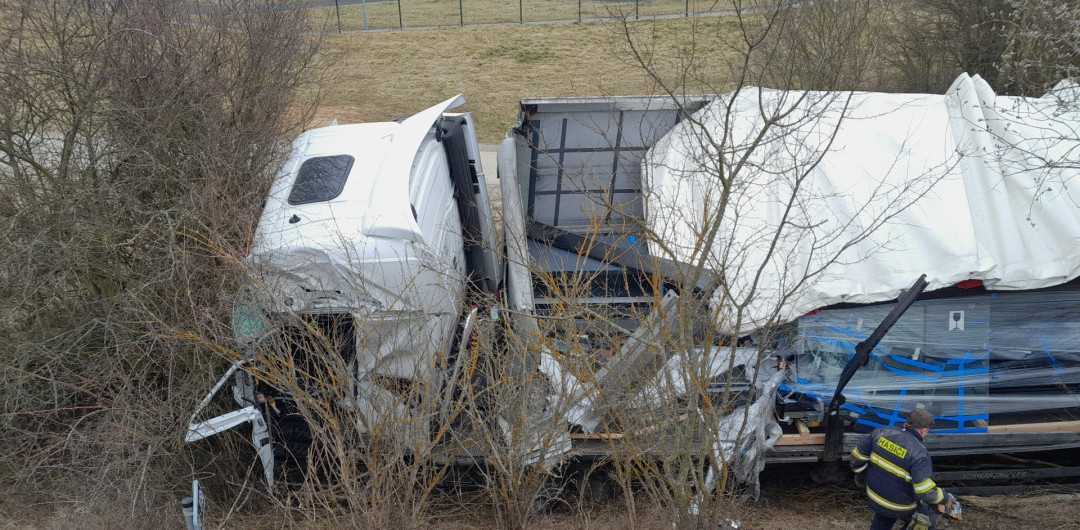 Vážná nehoda dvou kamionů, jeden z náklaďáků odmrštil náraz mimo silnici