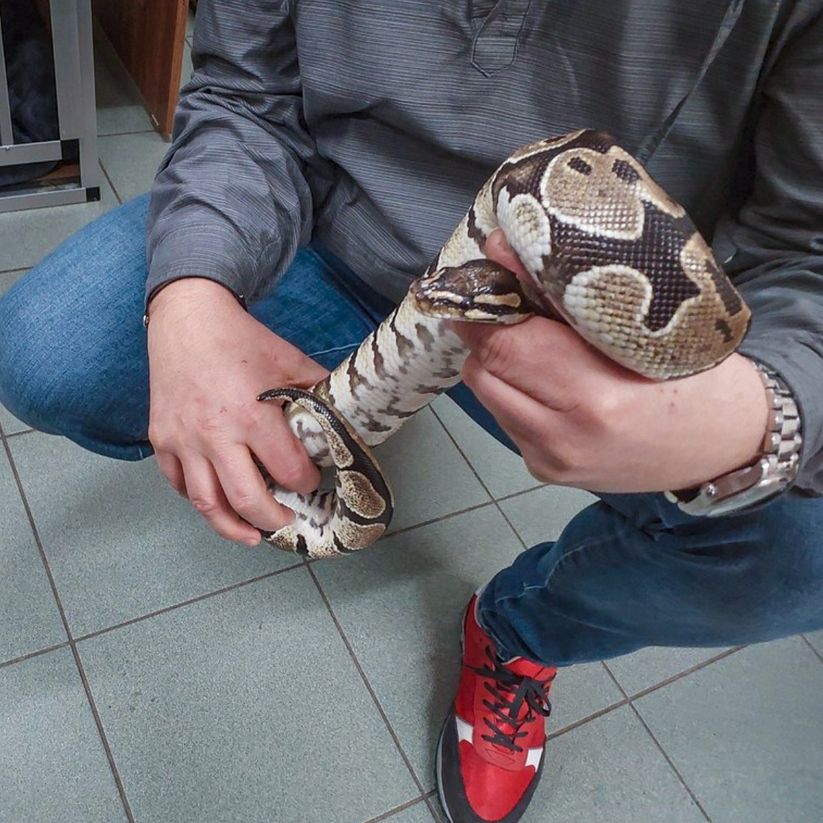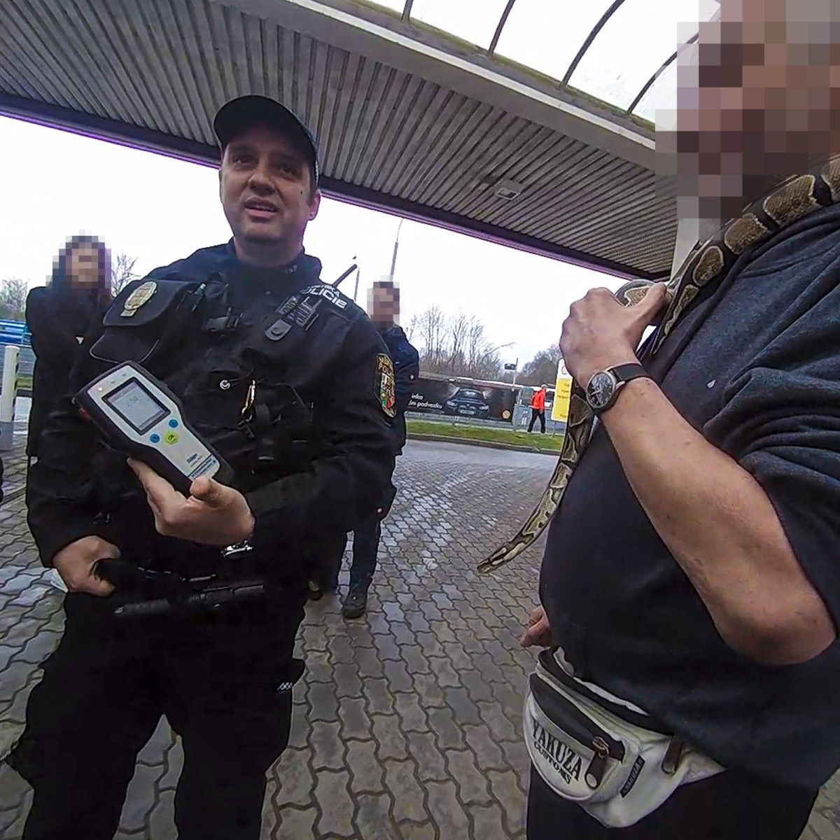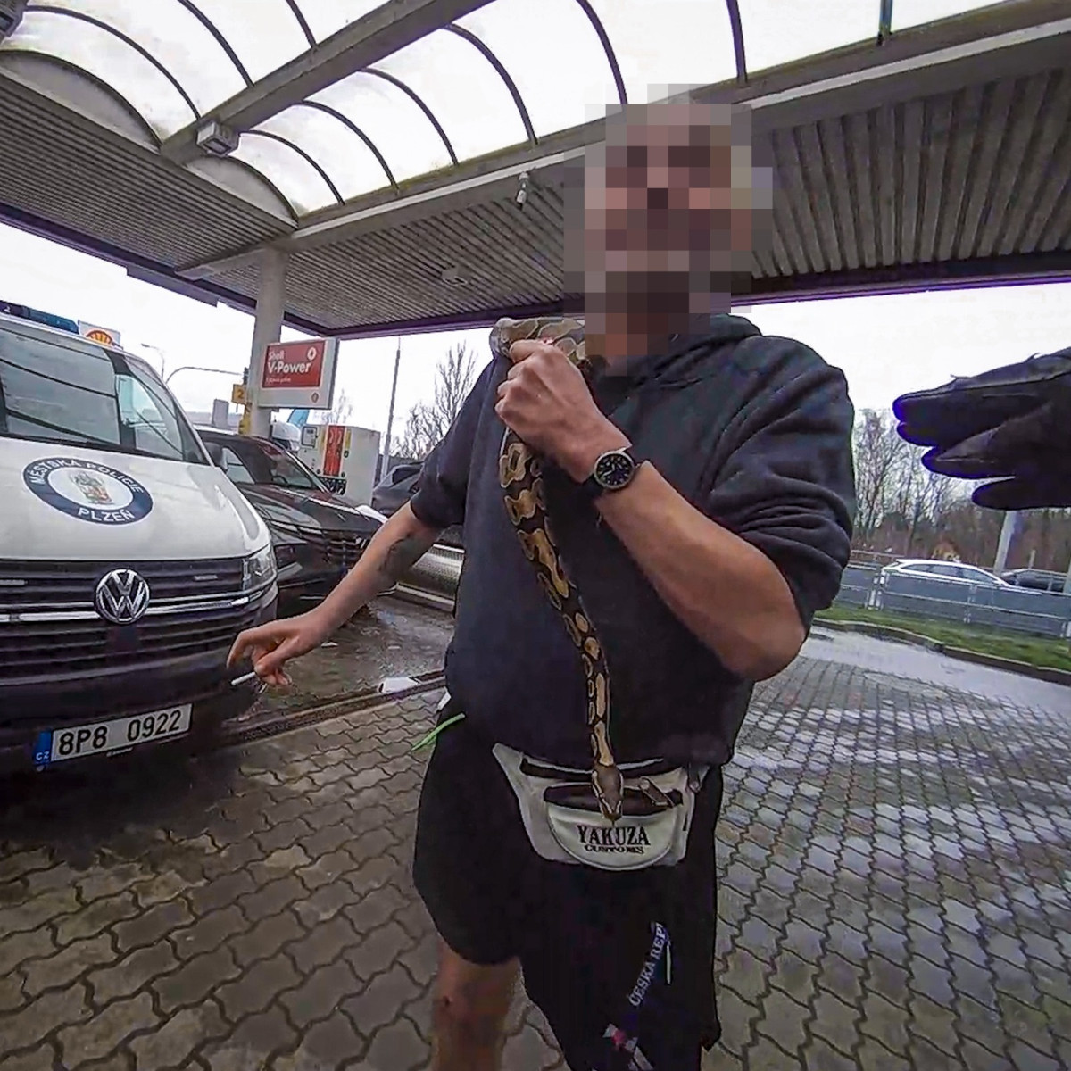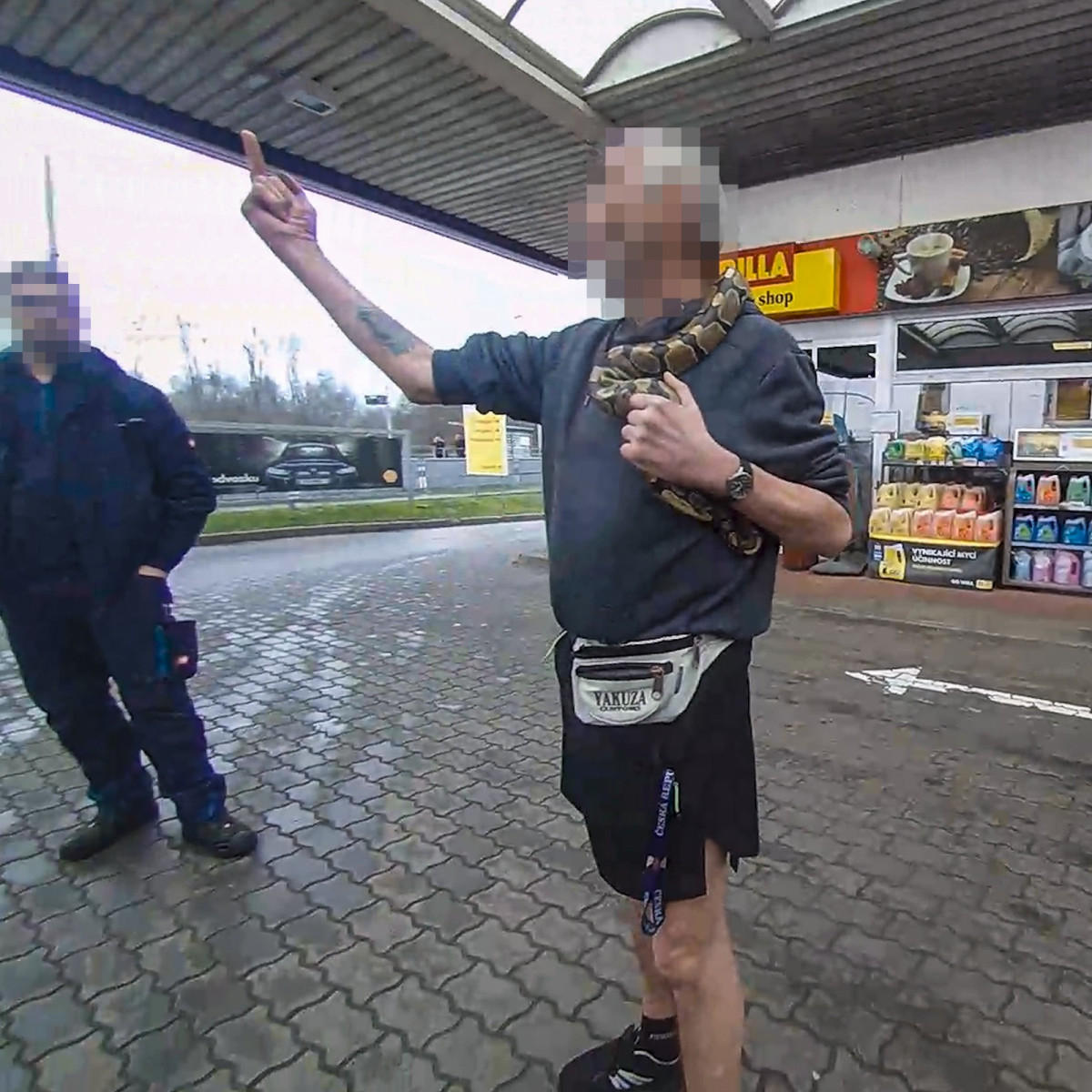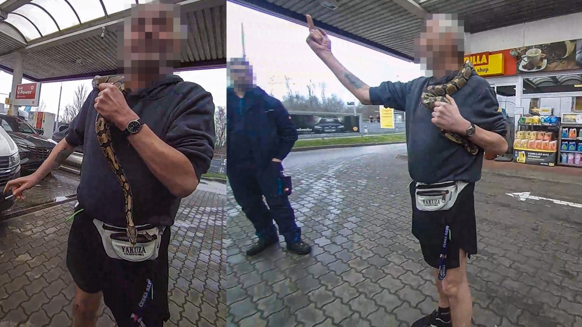 Agresivní muž s hadem na krku děsil a obtěžoval lidi na čerpací stanici. Jeho hlavu si několikrát strčil do pusy