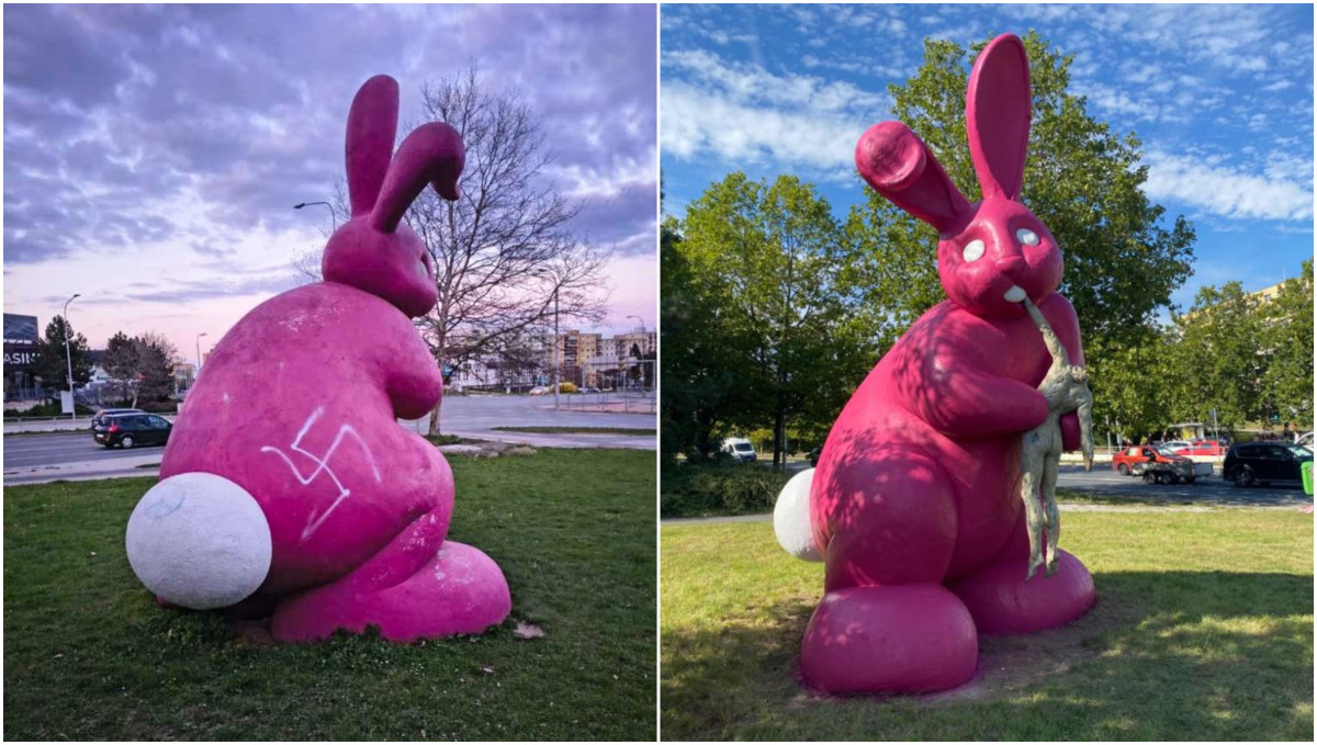 Vandal načmáral svastiku na kontroverzní sochu růžového králíka, nestalo se to zdaleka poprvé
