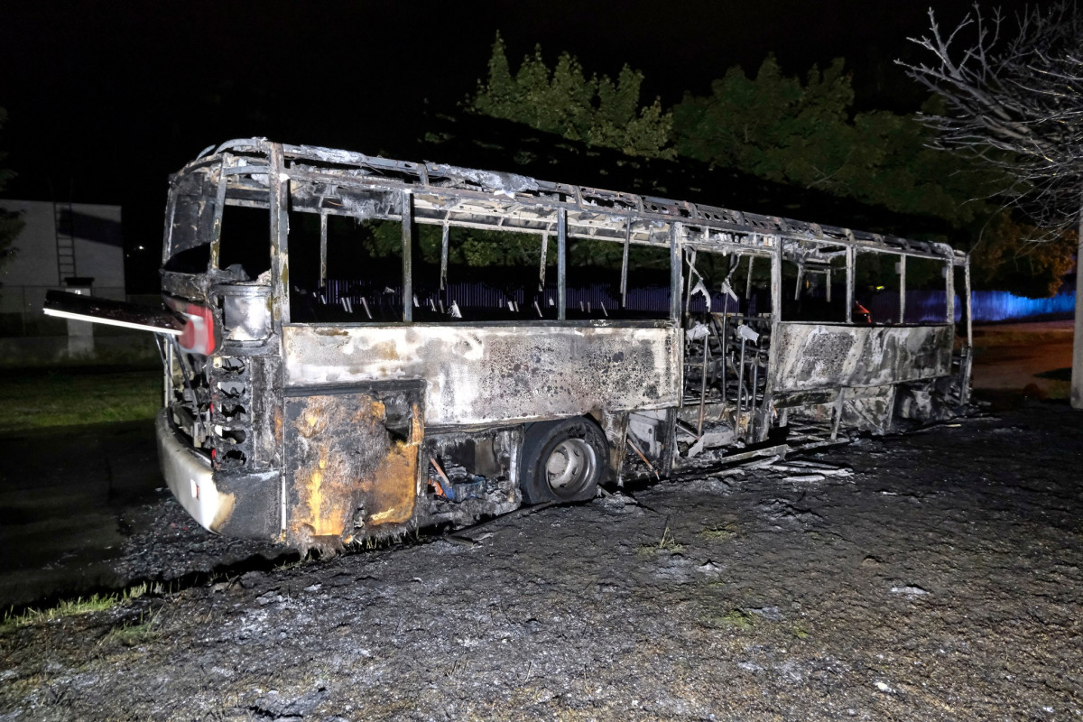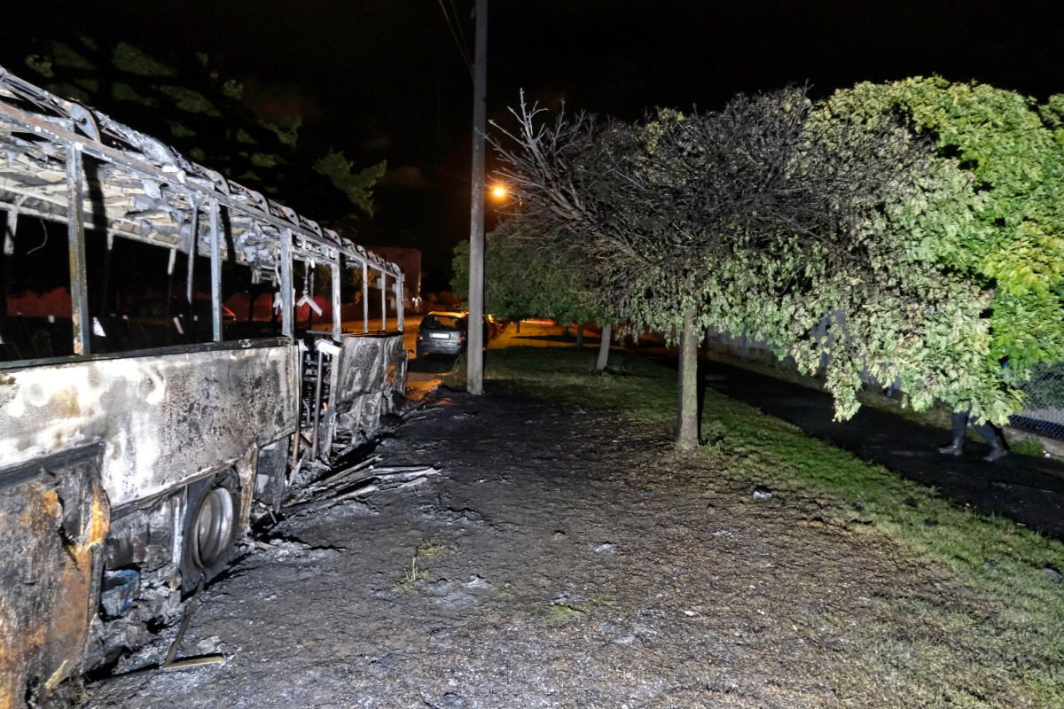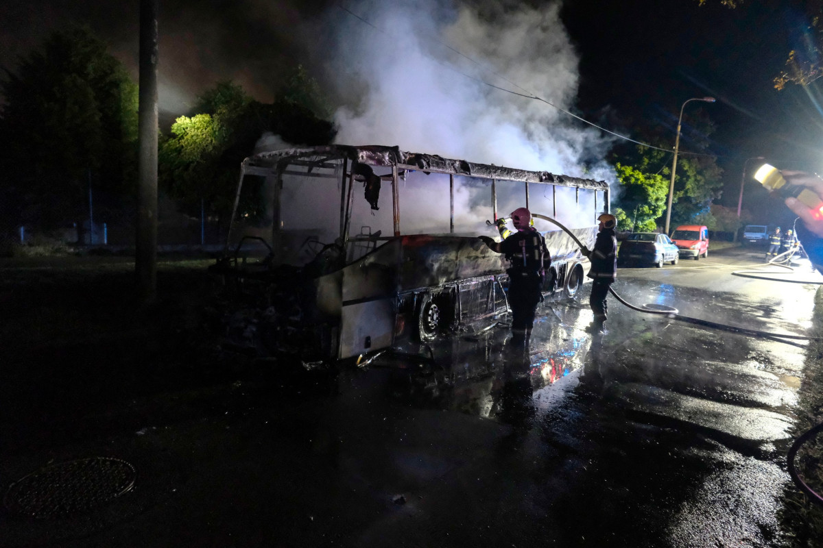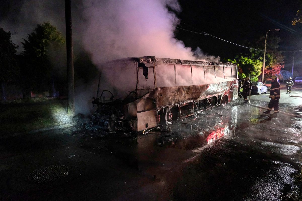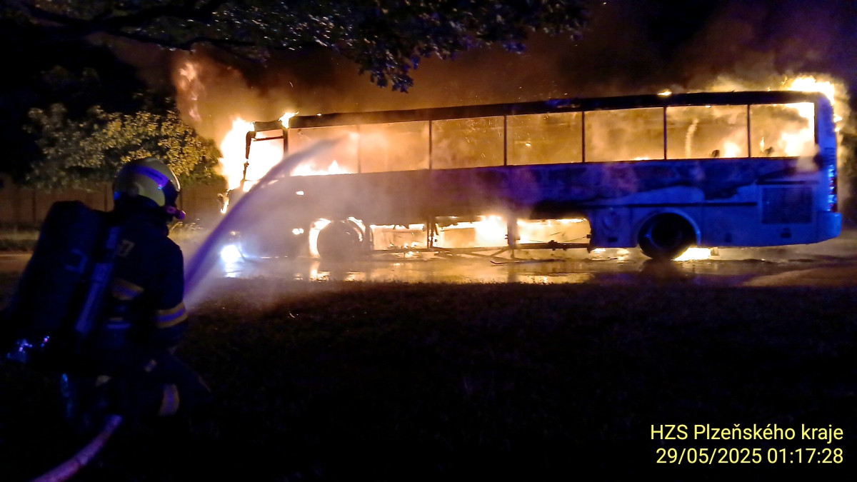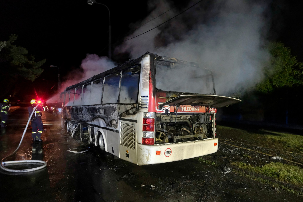 Autobus se proměnil v ohnivou kouli. Vysoko šlehající plameny poškodily i veřejné osvětlení