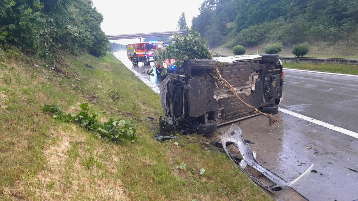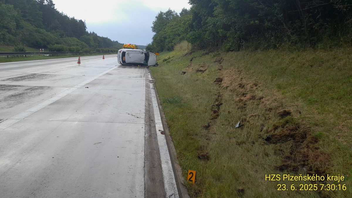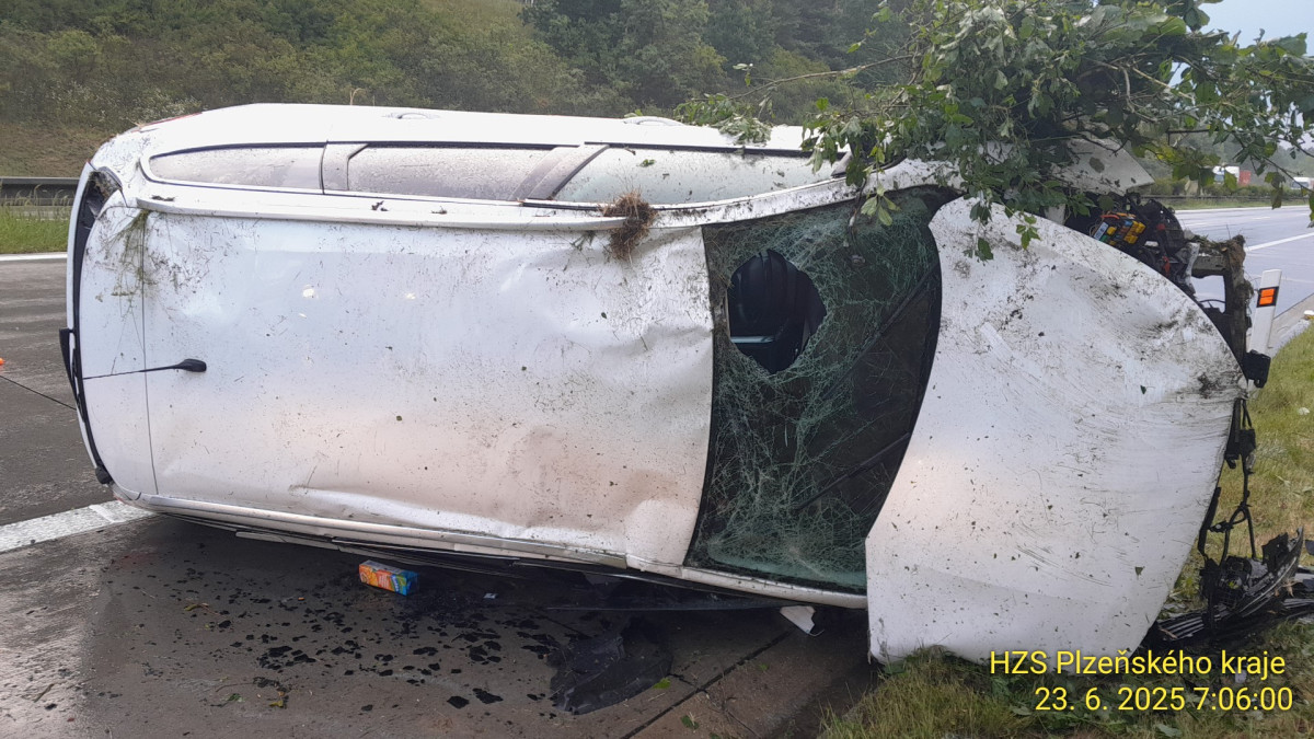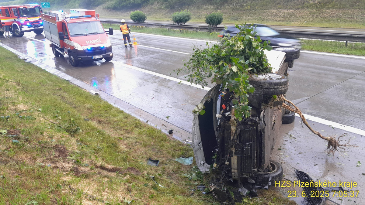 Hrozivá nehoda na dálnici D5. Auto vyletělo na mokru ze silnice až k lesu, kde vytrhlo strom