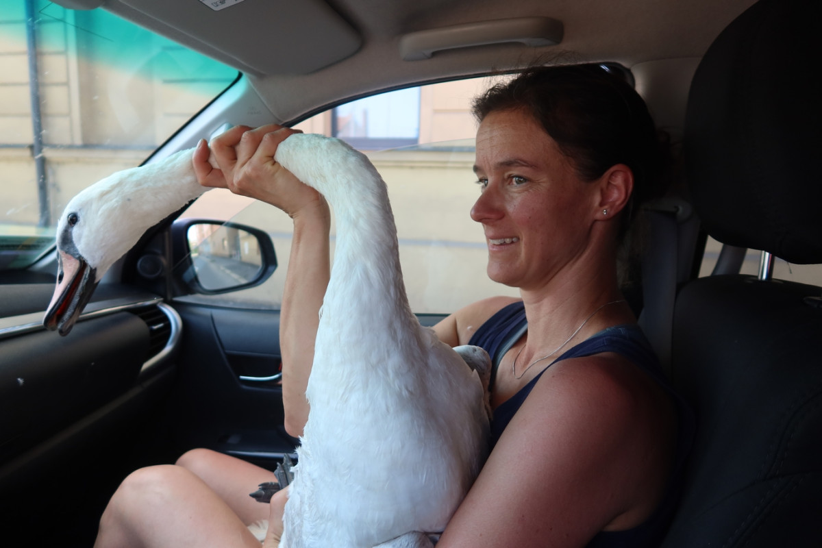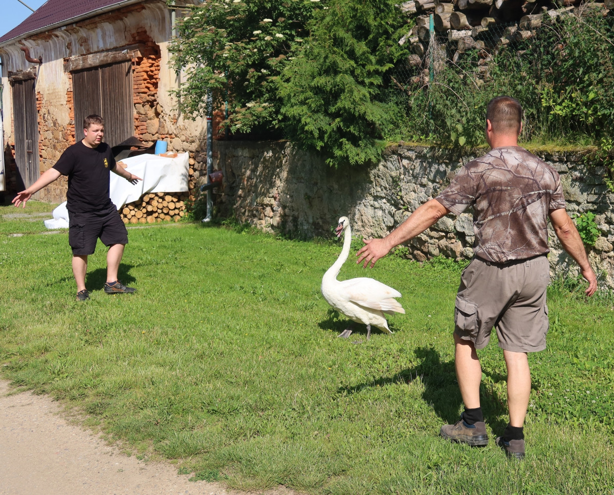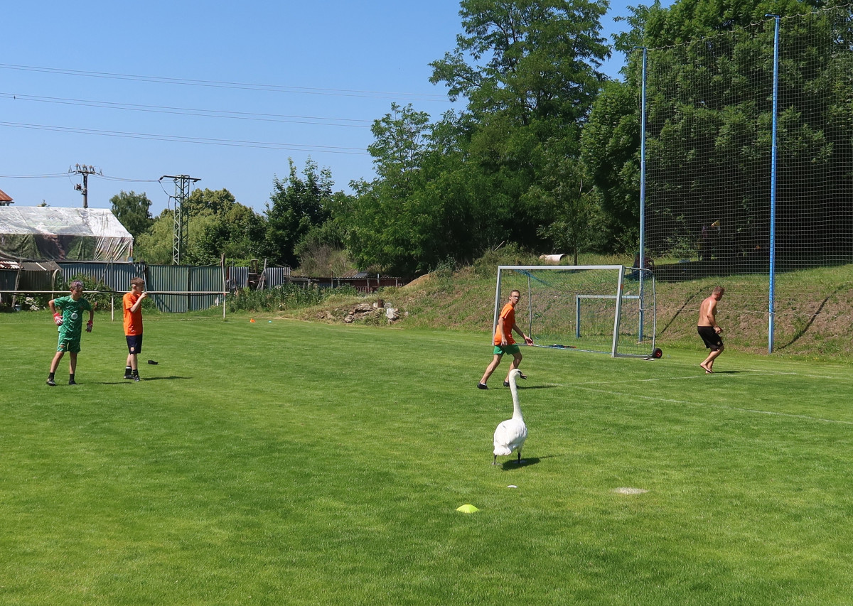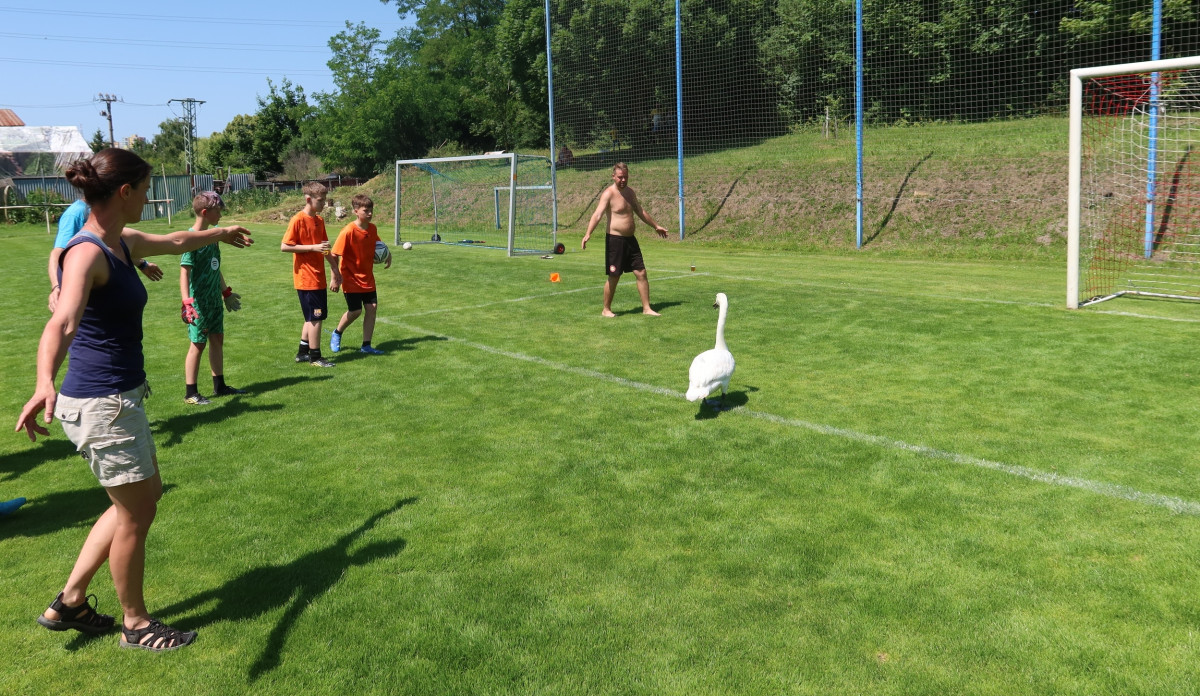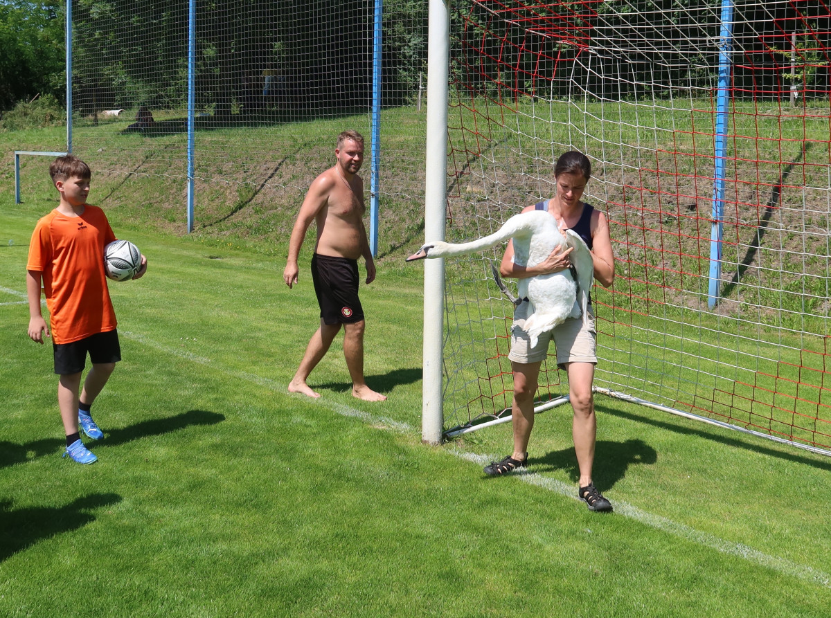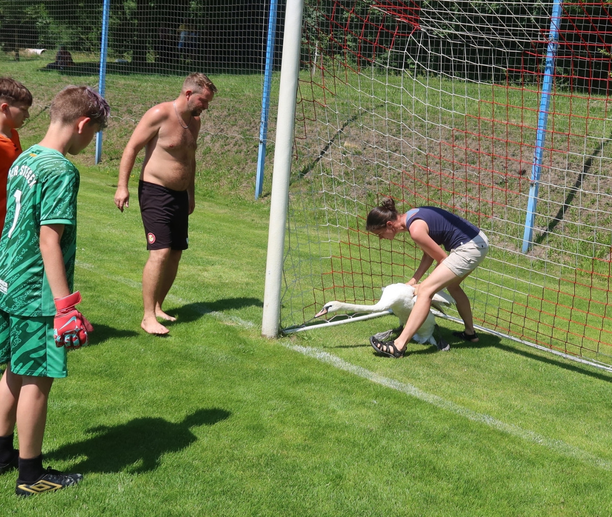 Zmatená labuť přistála během tréninku uprostřed fotbalového hřiště. Chytili ji v bráně