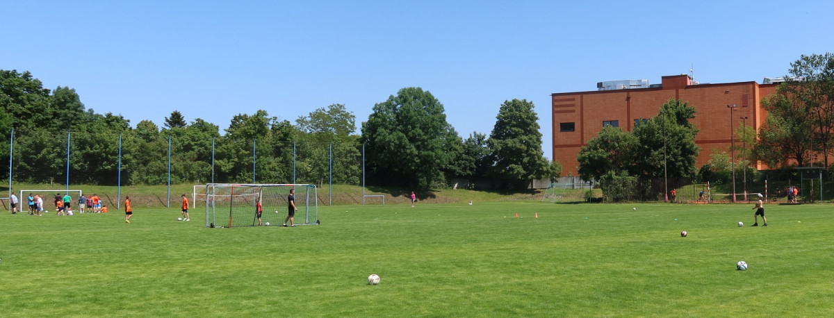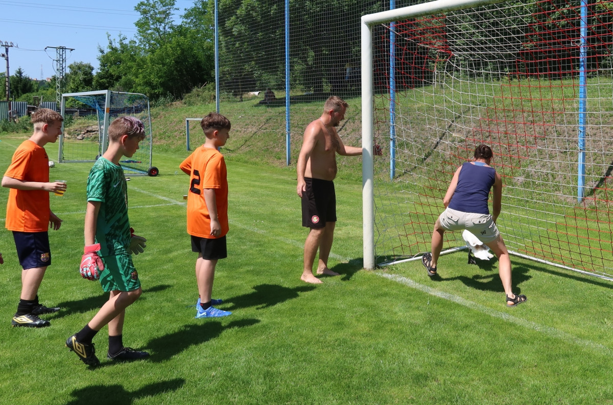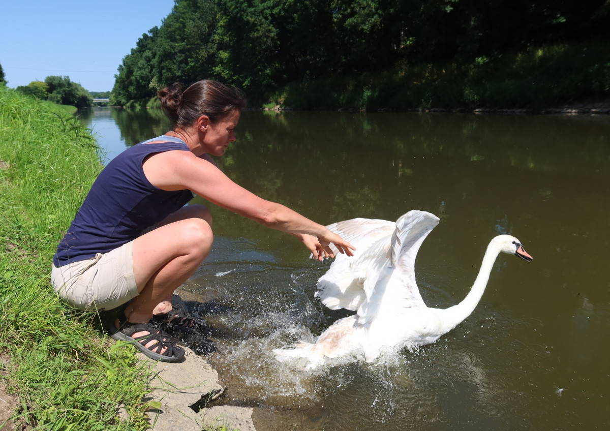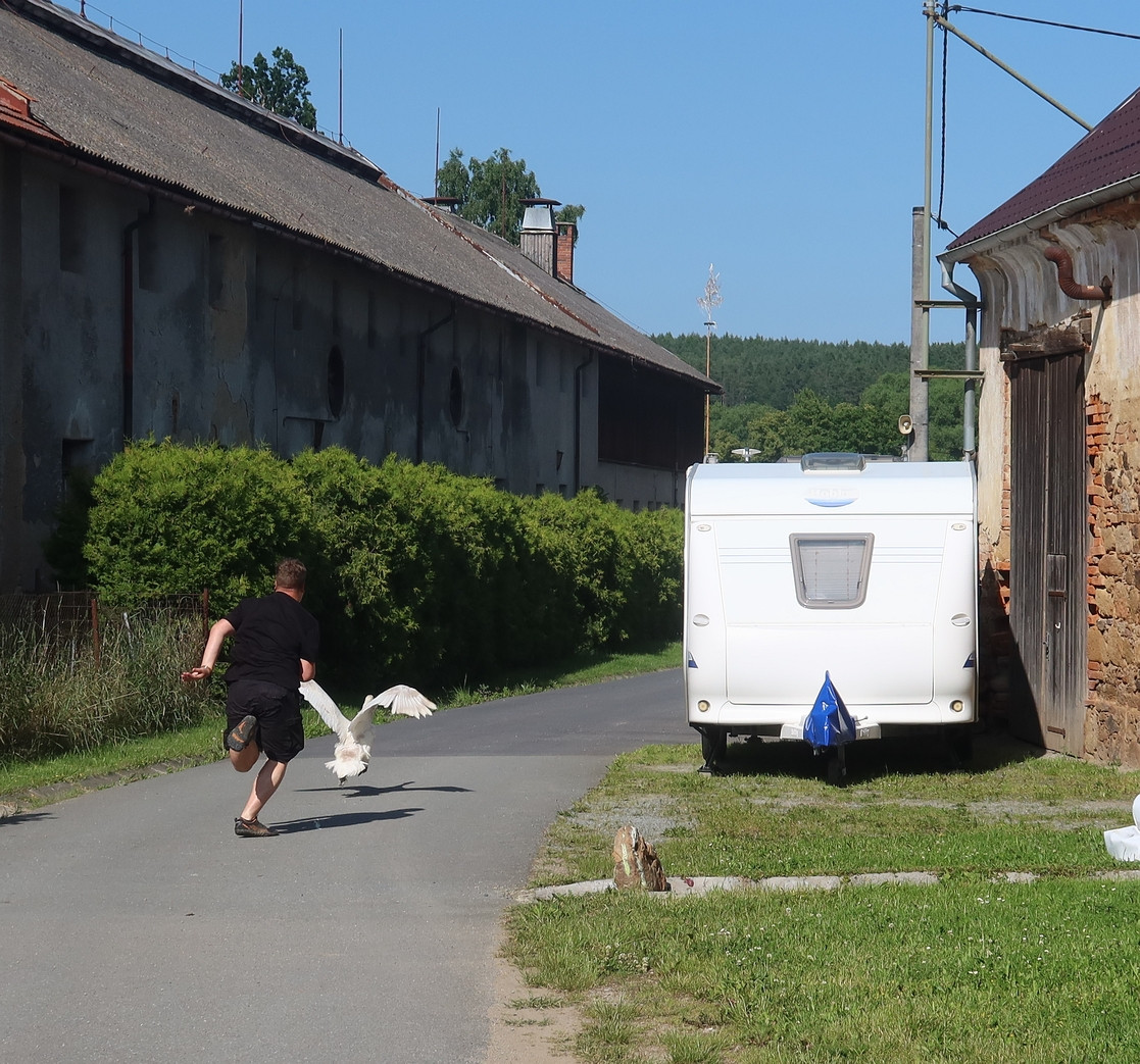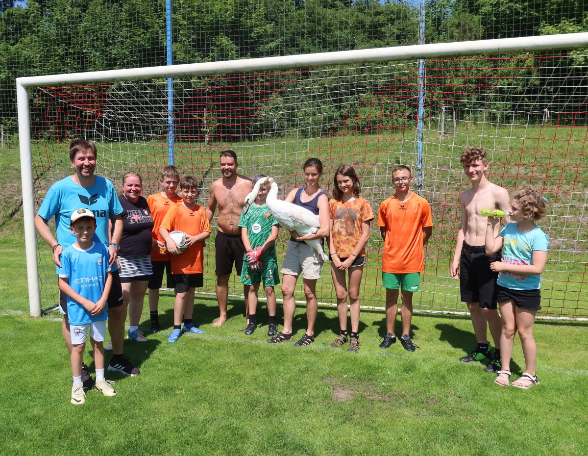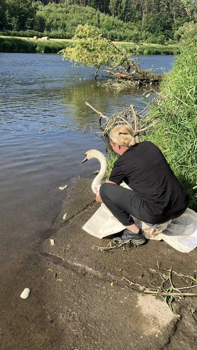 Zmatená labuť přistála během tréninku uprostřed fotbalového hřiště. Chytili ji v bráně