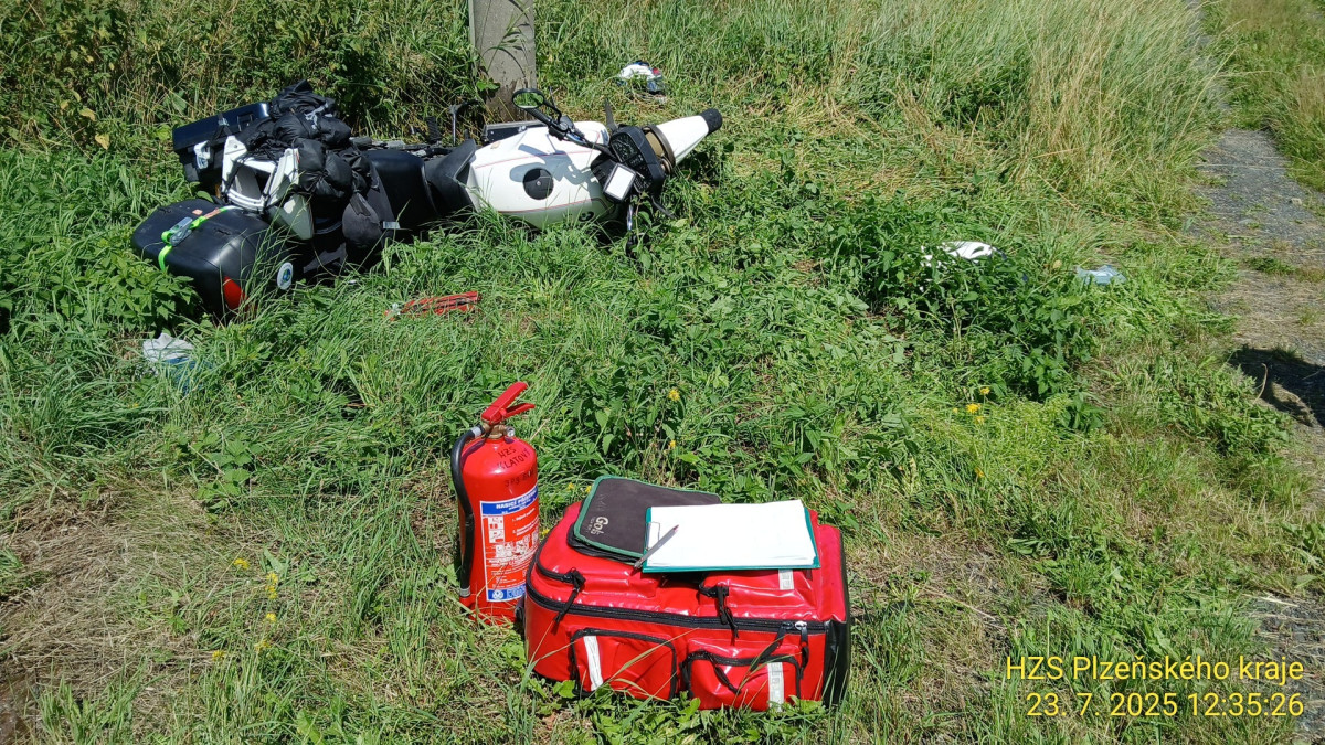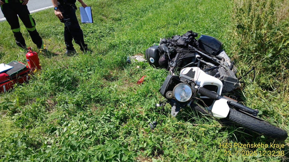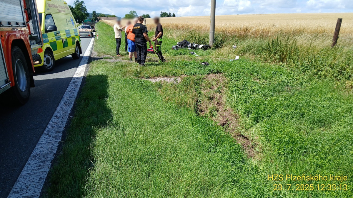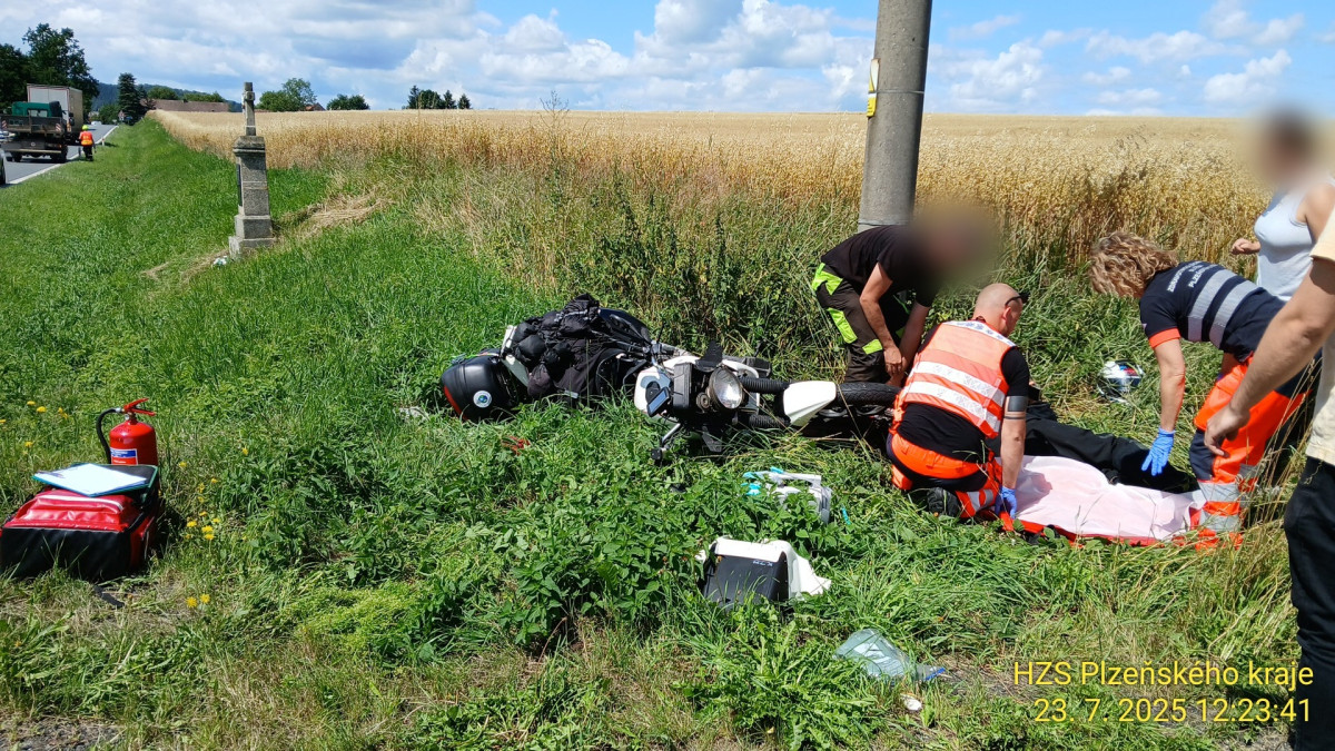 Po čelním nárazu auta do stromu se vážně zranil řidič. Ve stejnou dobu se nedaleko vyboural motorkář