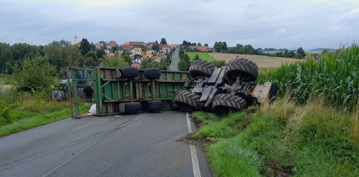Převrácený traktor zcela zablokoval provoz na silnici u Plánice