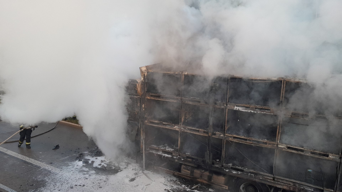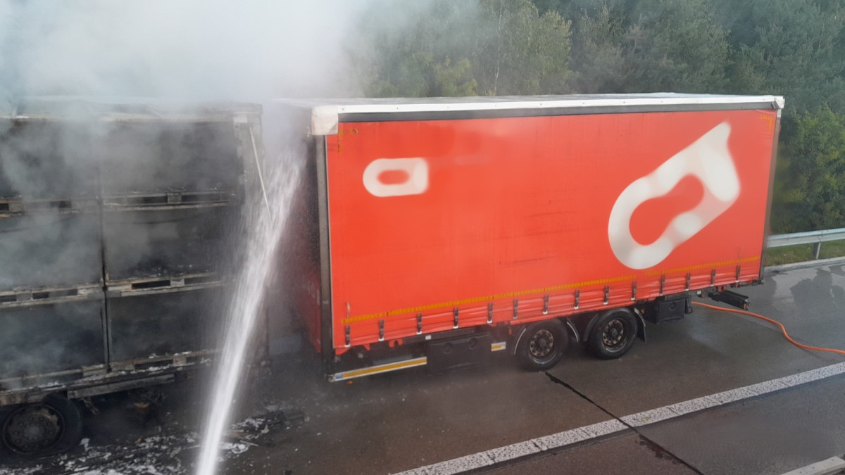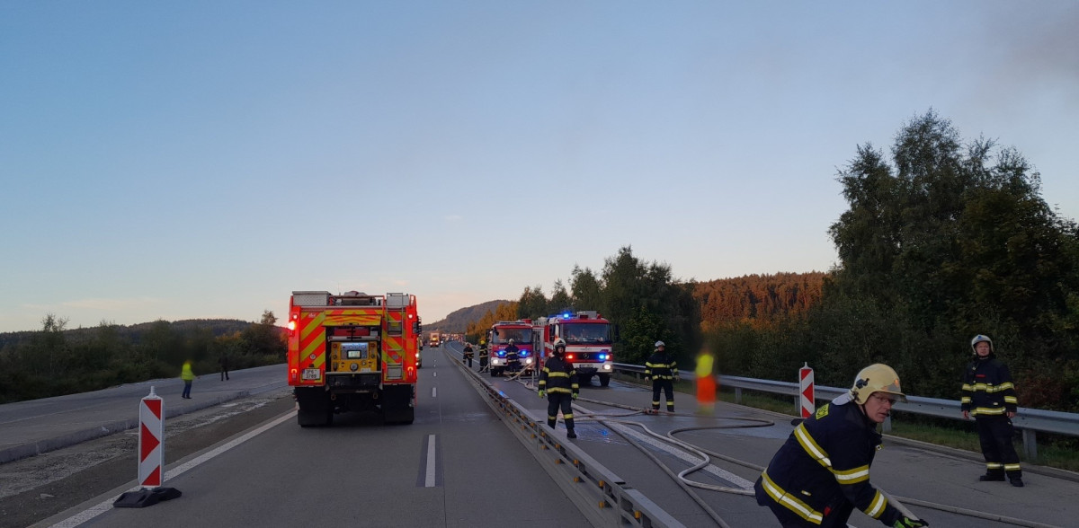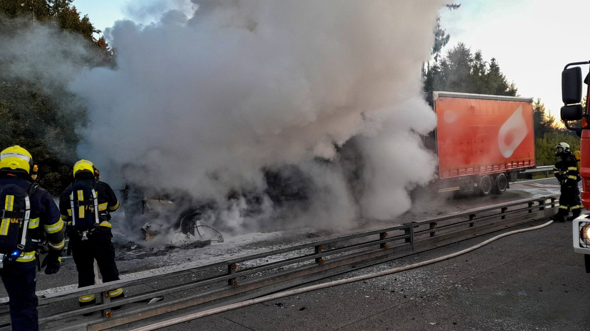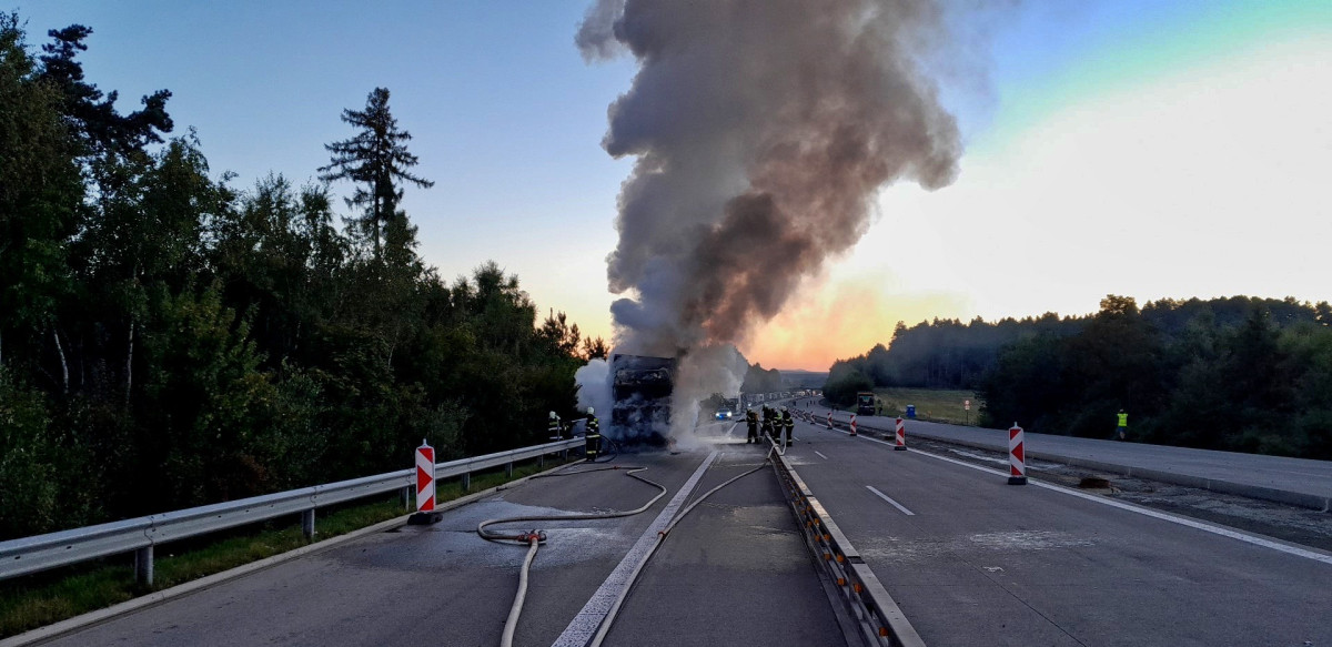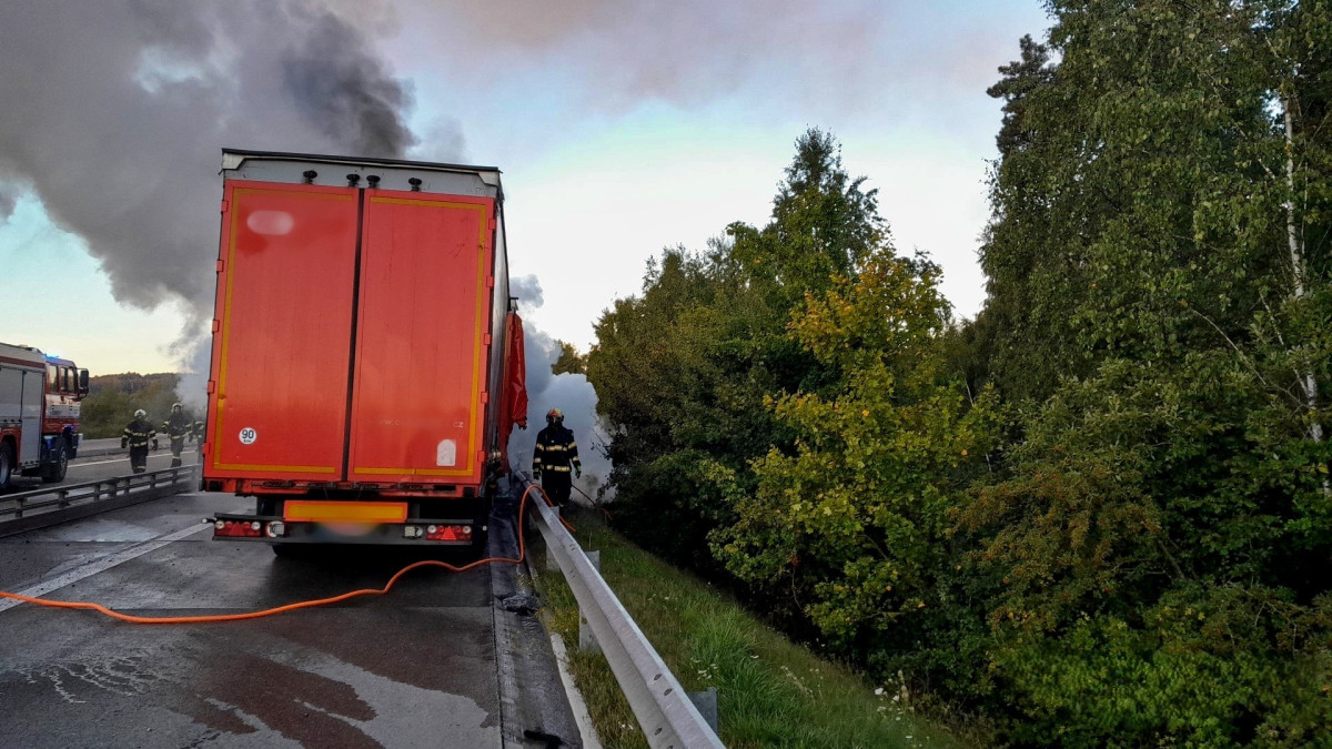 Požár kamionu ochromil provoz na dálnici D5, hasiči museli rozebrat část svodidel
