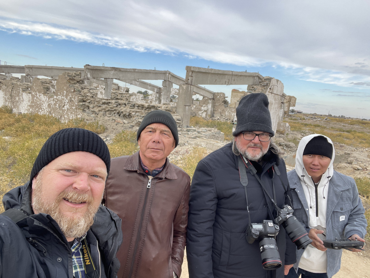Expediční tým - Štěpán Černoušek, Turganbek Alanijazov, Pavel Vařeka a Akžol Dosnazarov (zleva) u jednoho z bývalých táborů Stěplagu