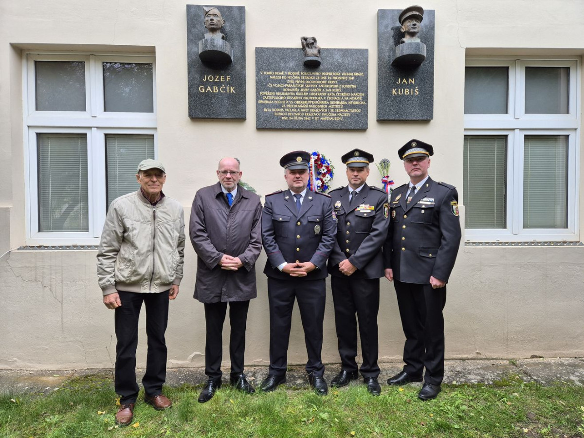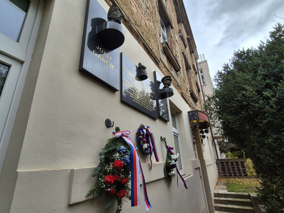 Pietní akt u pamětní desky před domem, kde žila rodina zavražděných hrdinů