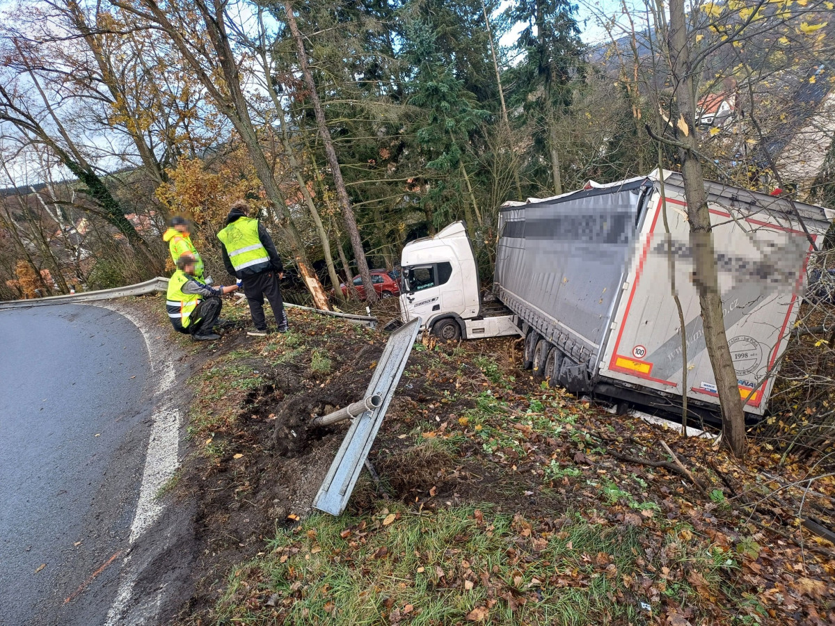Kamion prorazil svodidla a skončil mimo silnici ve svahu. Řidič měl mikrospánek