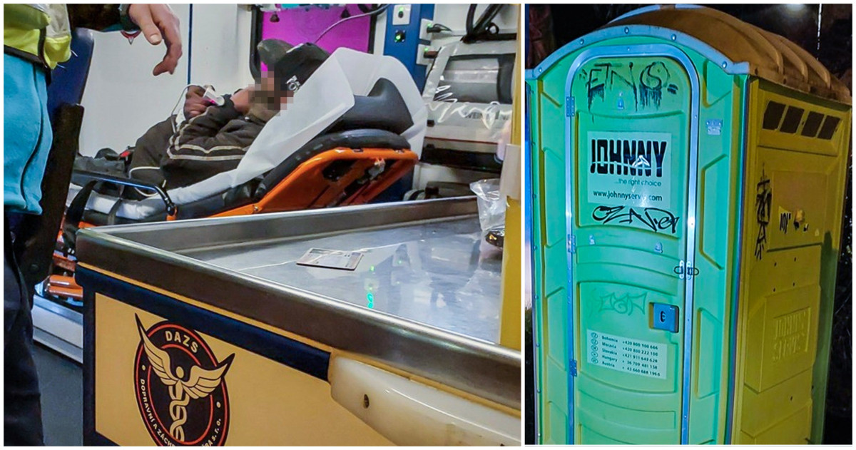 Z nitra mobilního WC se ozývalo volání o pomoc, uvnitř seděl opilý a zoufalý muž