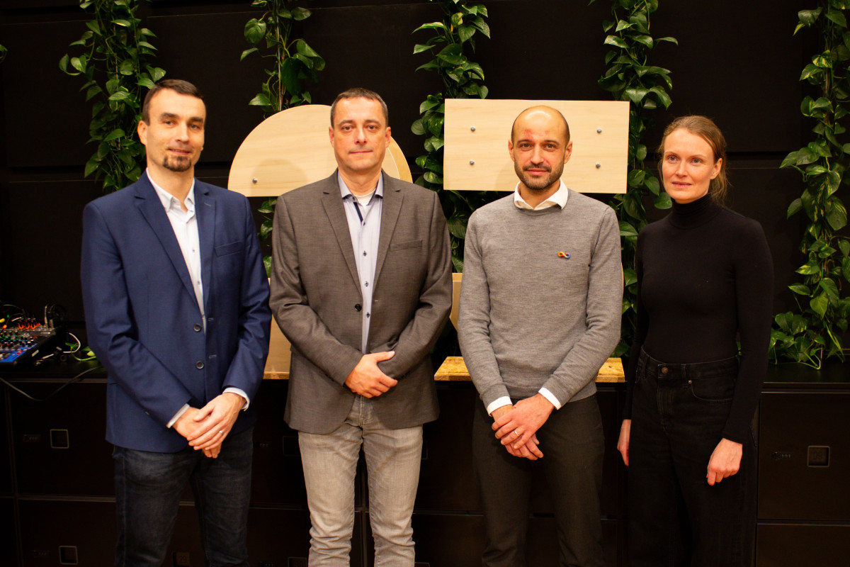 Autoři chytré obuvi a rukavic se zástupci projektu nextdrop (Radek Soukup, Petr Kašpar, František Mach, Petra Drexler)