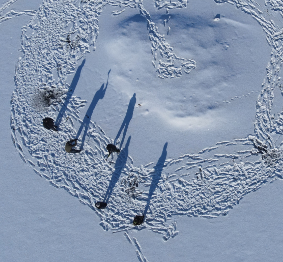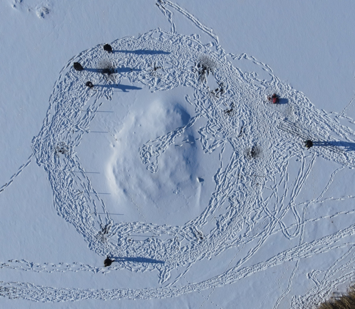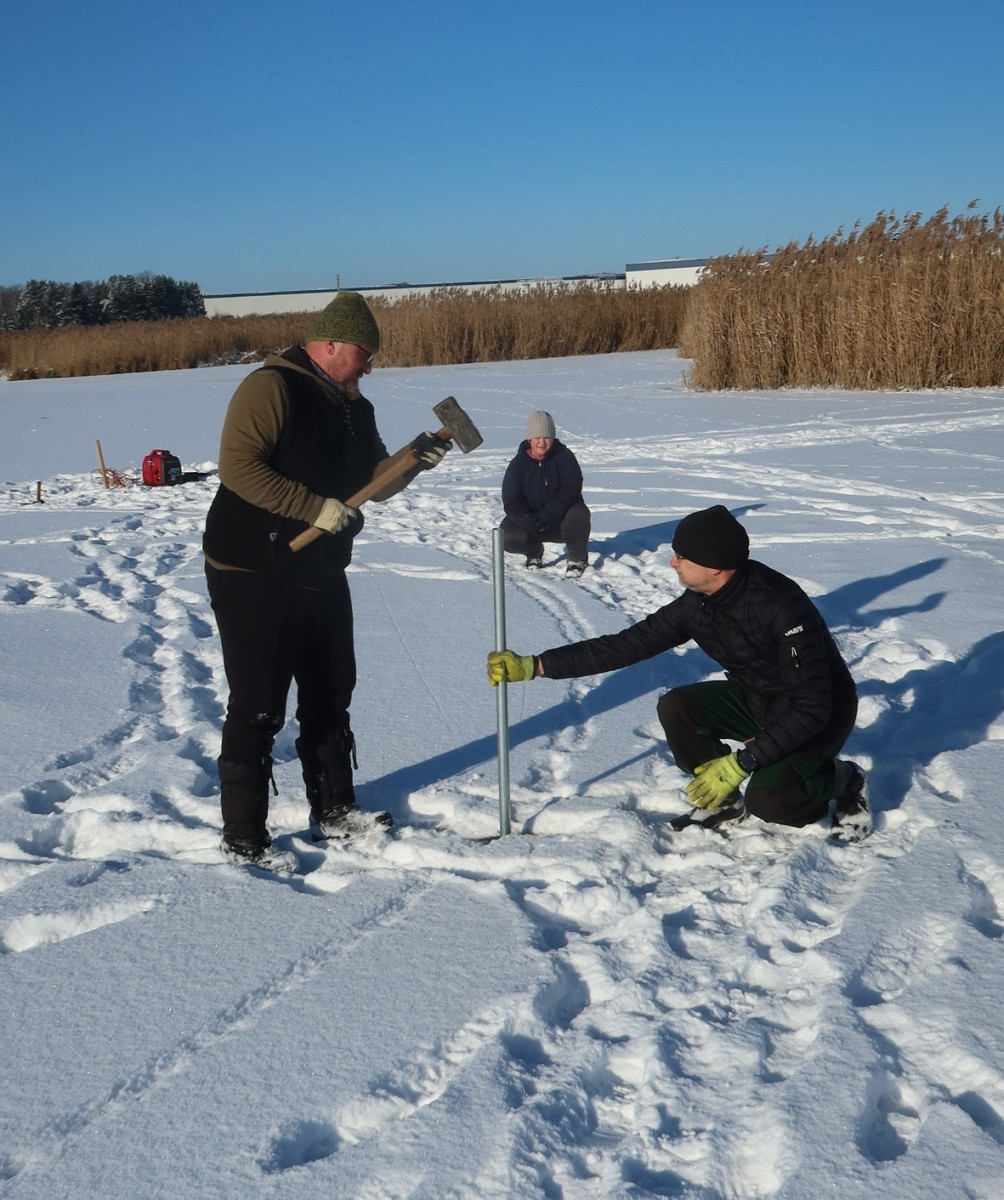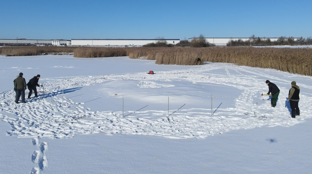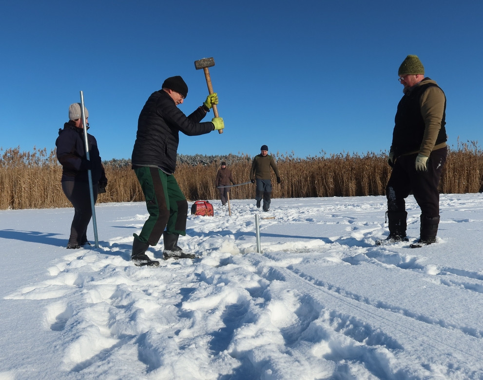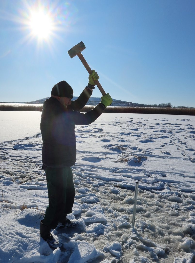 Zamrzlý rybník umožnil zatlouct trubky do dna. Vznikne hnízdní ostrůvek pro racky