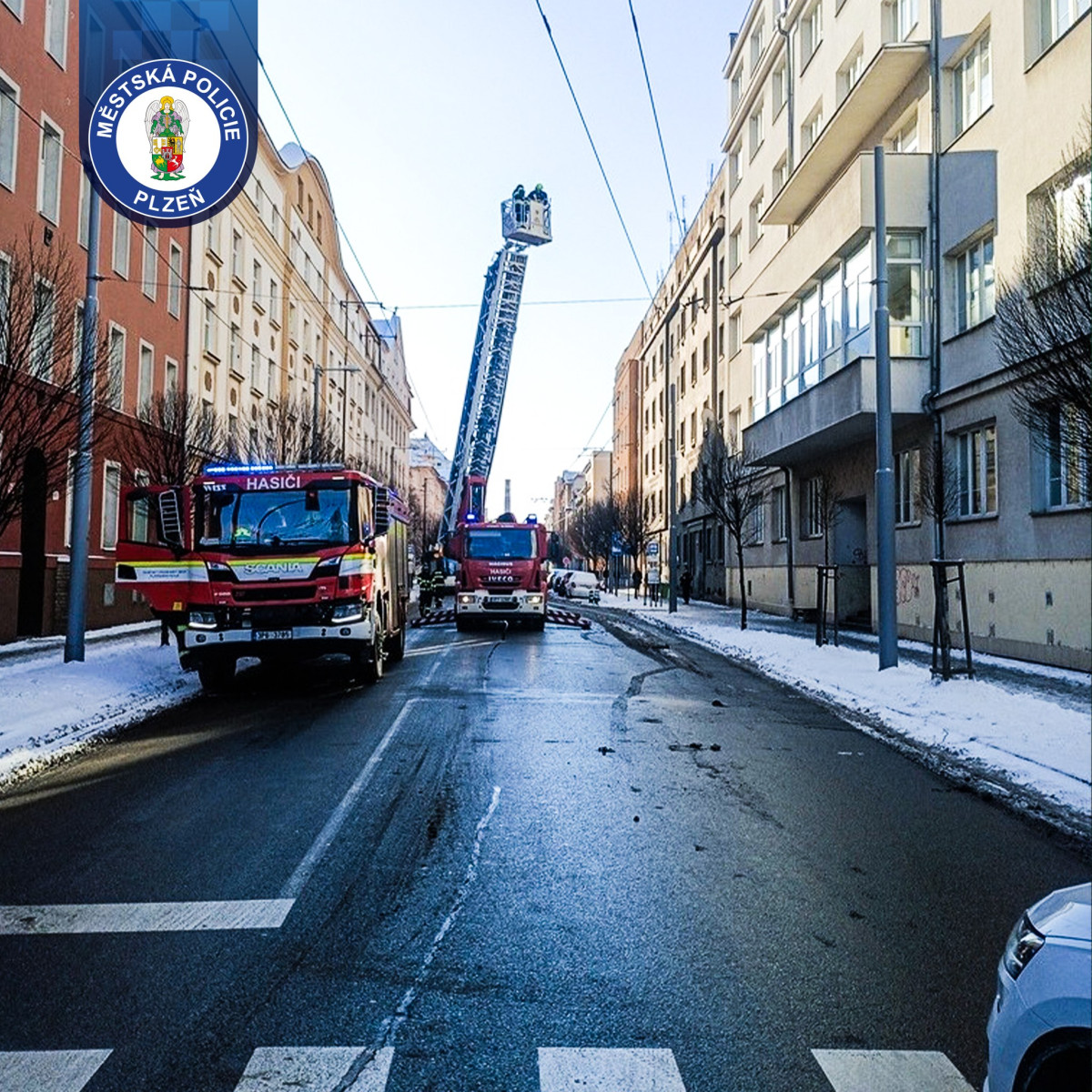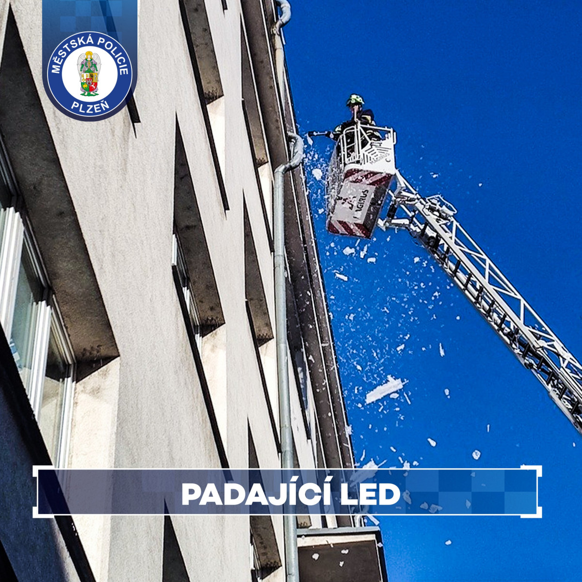 Padající led ohrožoval chodce v Plzni na Slovanech, foto: Městská policie Plzeň