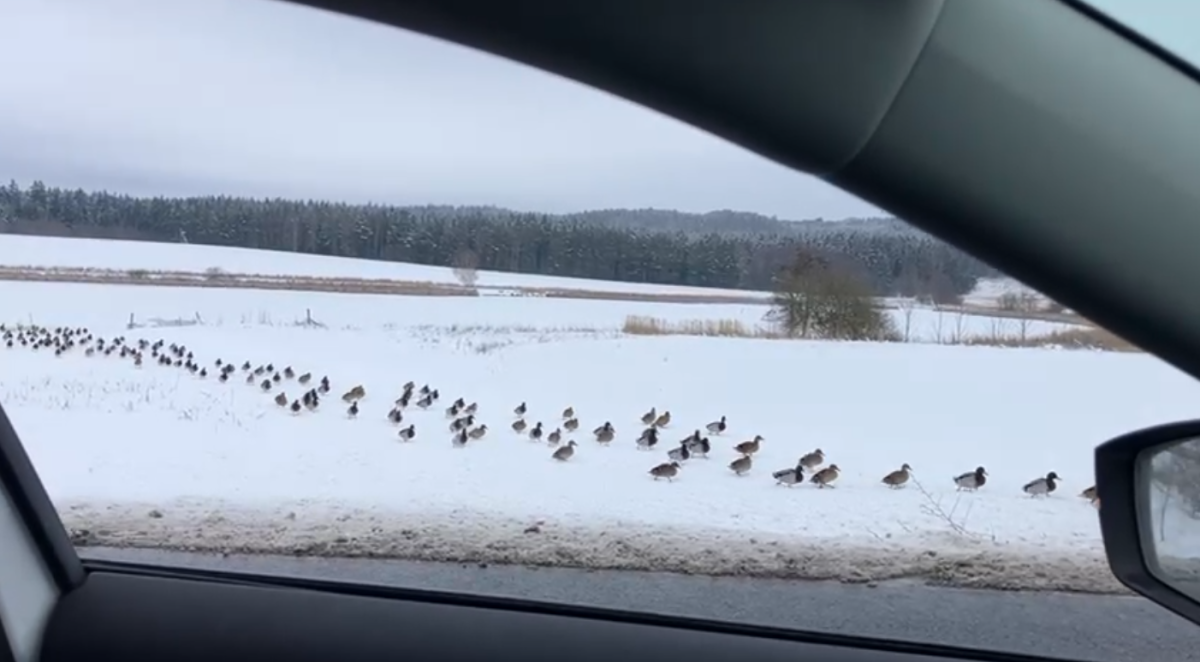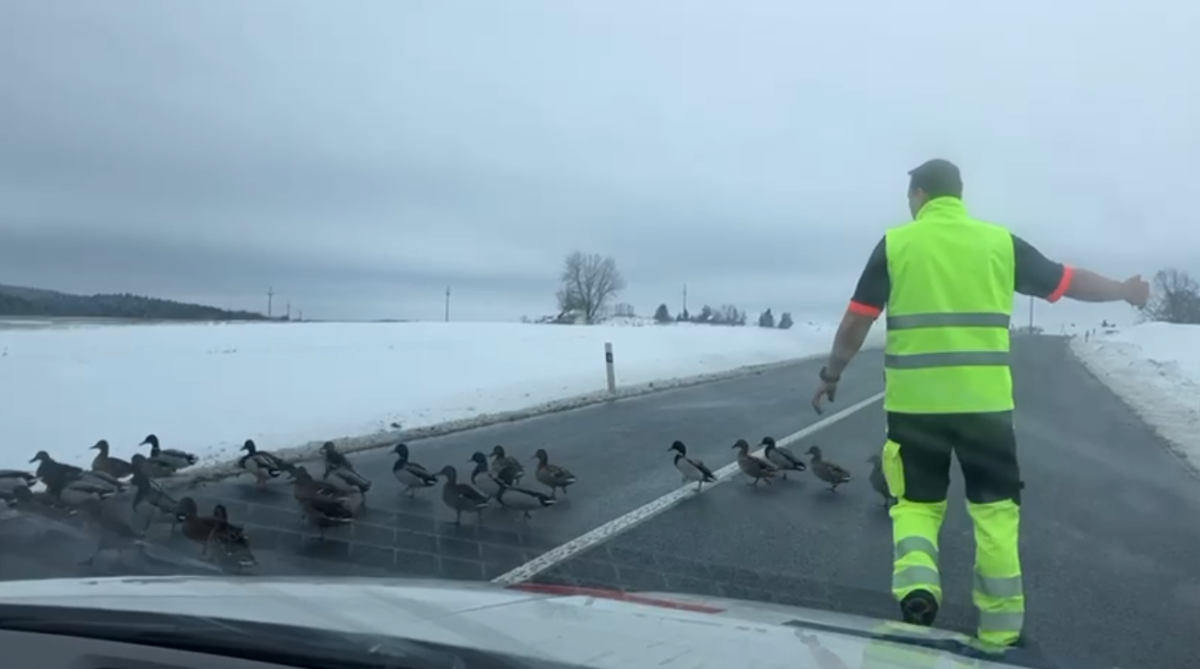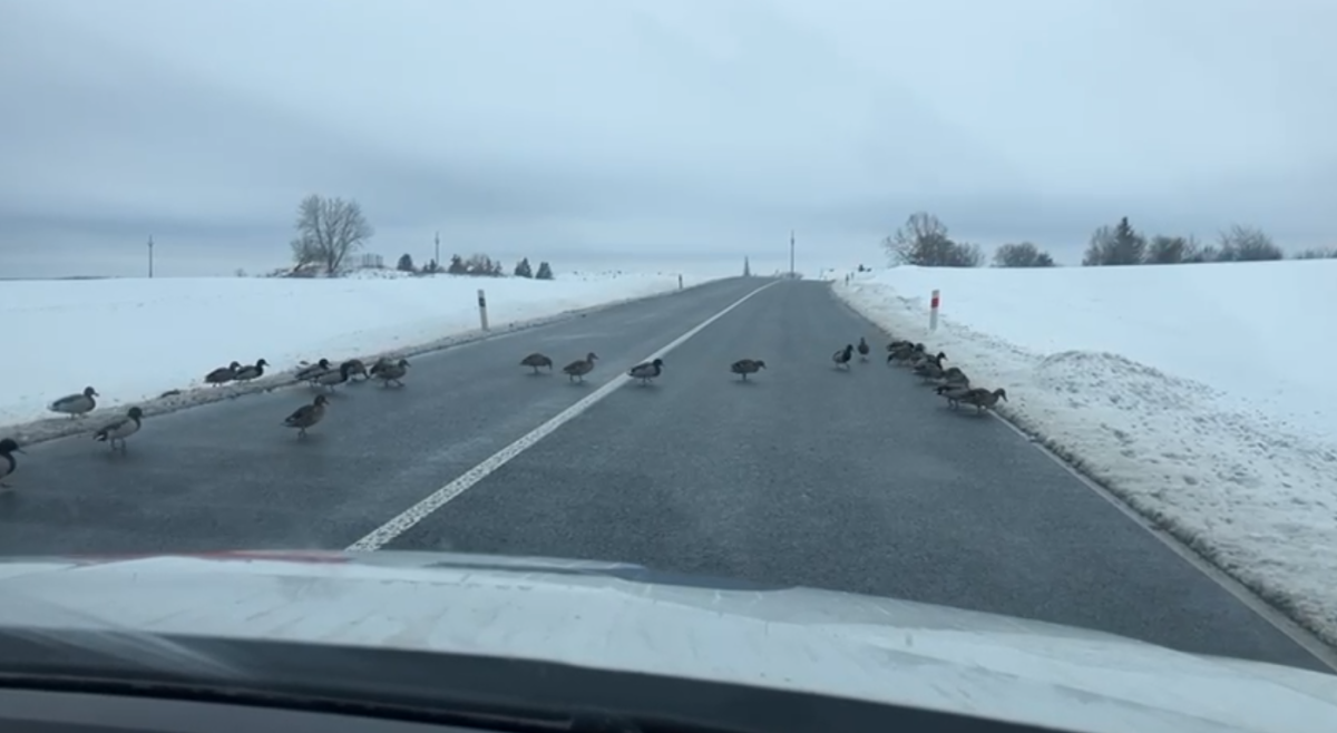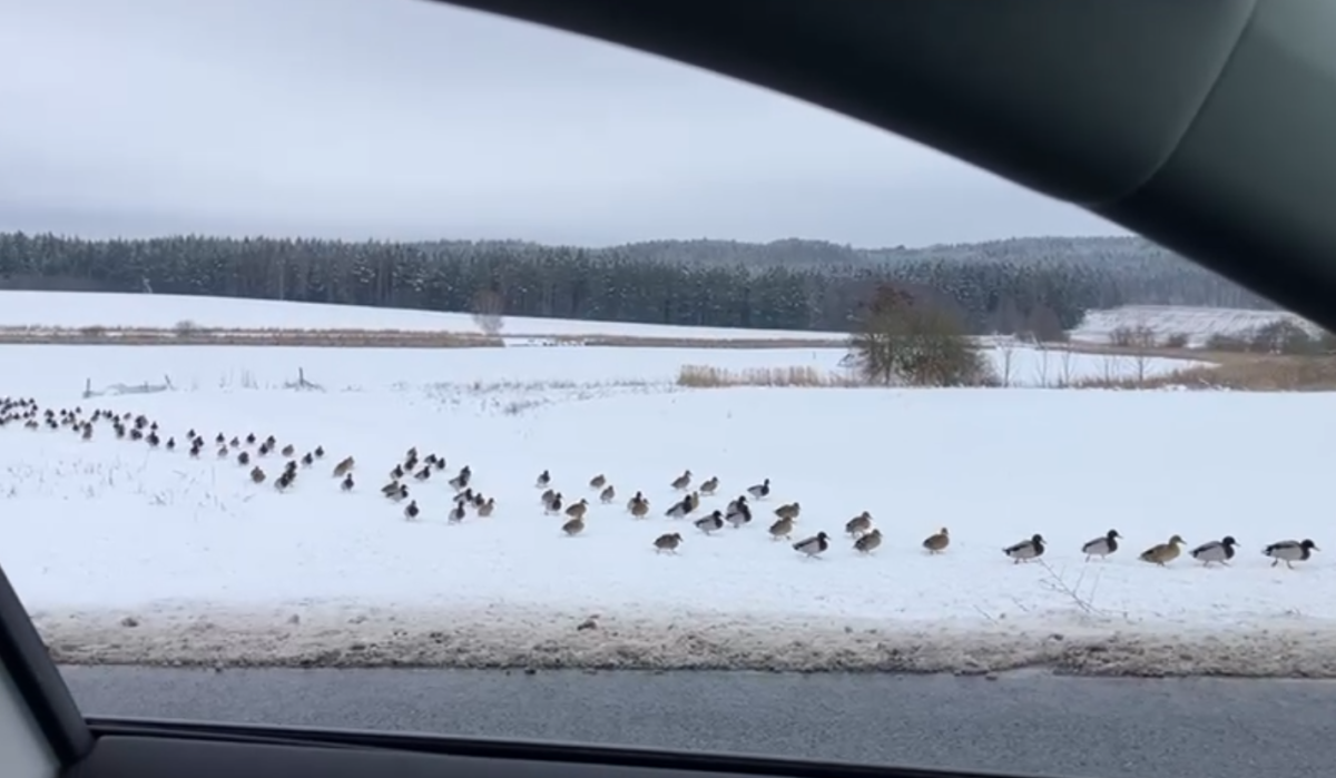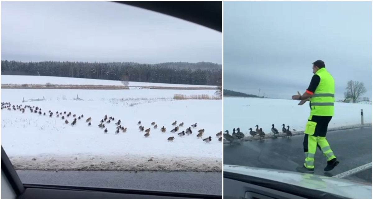 Stovky kachen se vydaly na pochod k rušné silnici, odehnal je záchranář