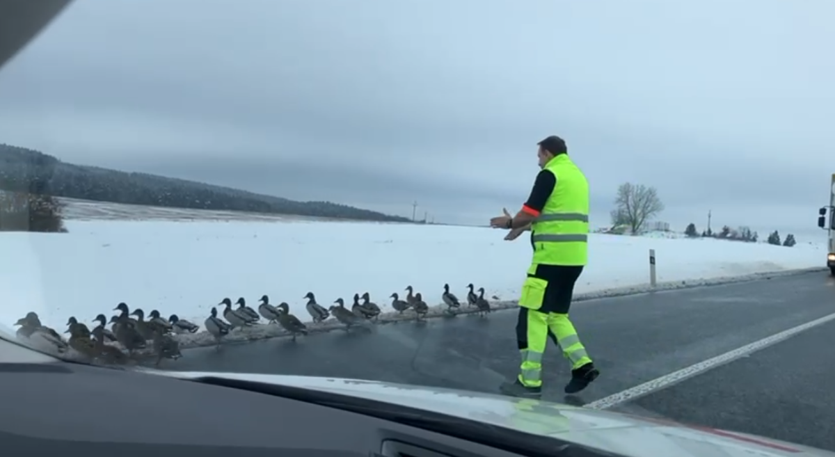 Stovky kachen se vydaly na pochod k rušné silnici, popoháněl je záchranář