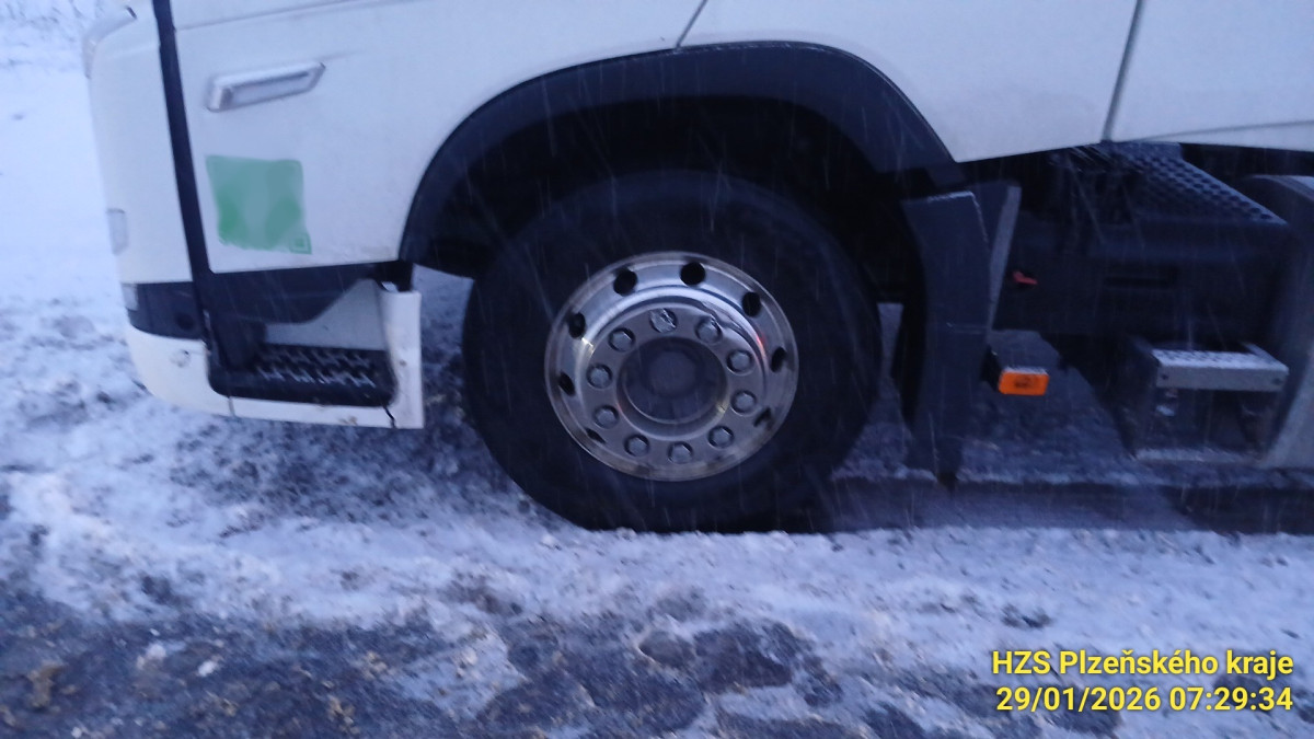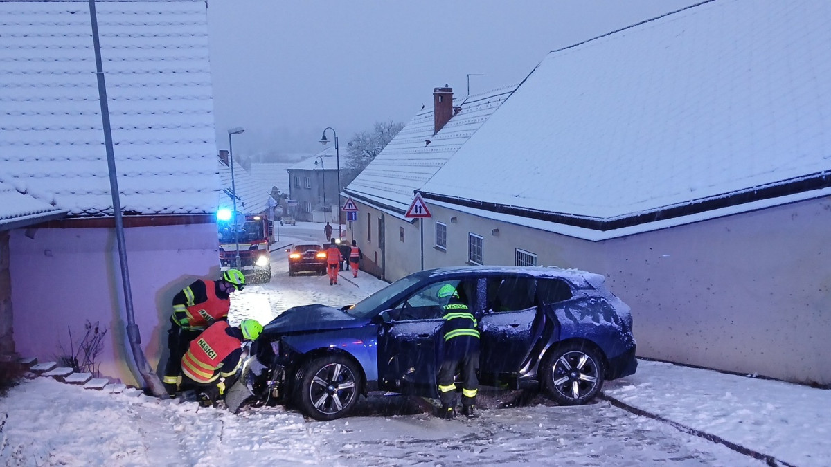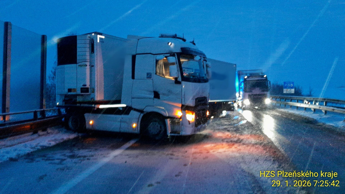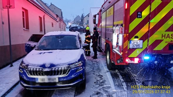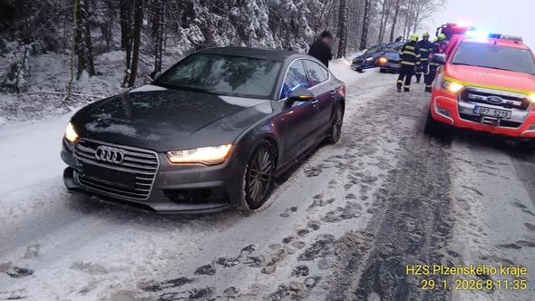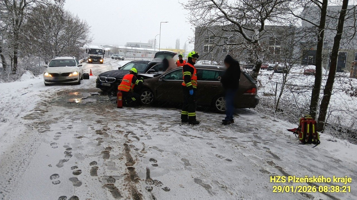 Sníh ochromil silnice i dálnici D5. Hasiči se záchranáři vyjíždí k řadě nehod