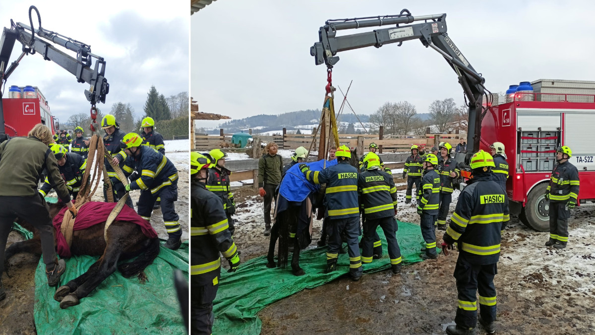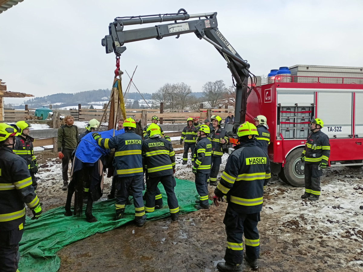 Kůň upadl na zem a nedokázal vstát. Na pomoc přijeli hasiči s hydraulickou rukou