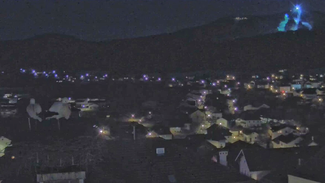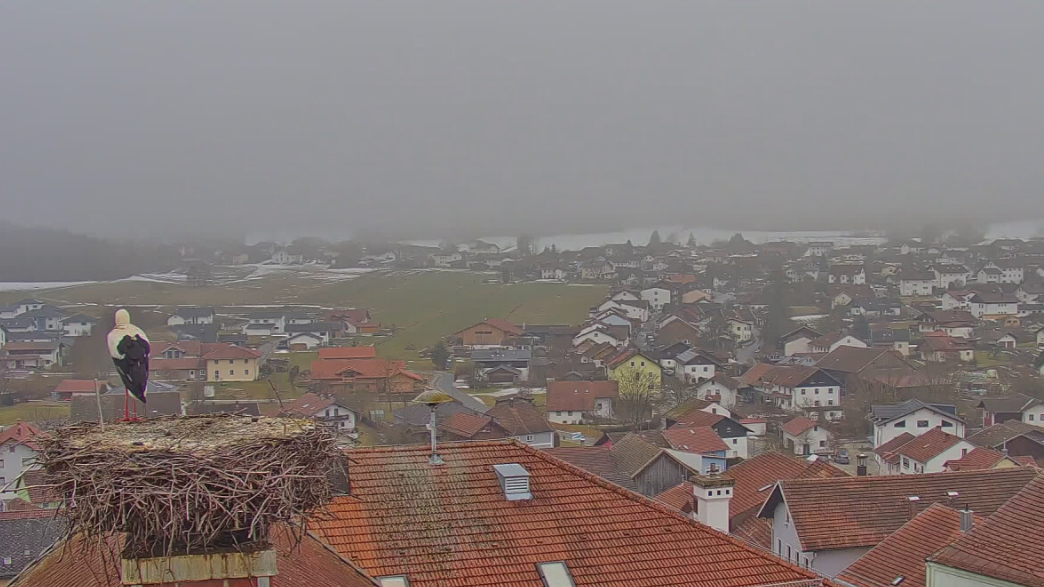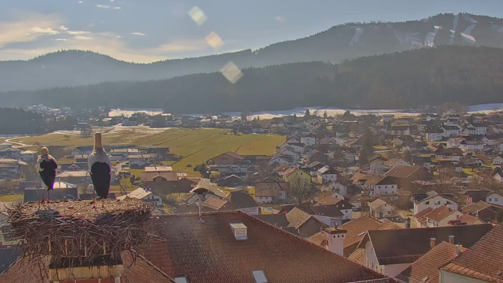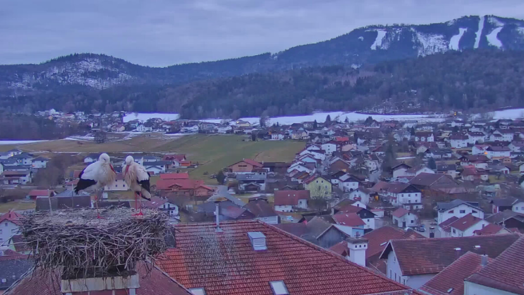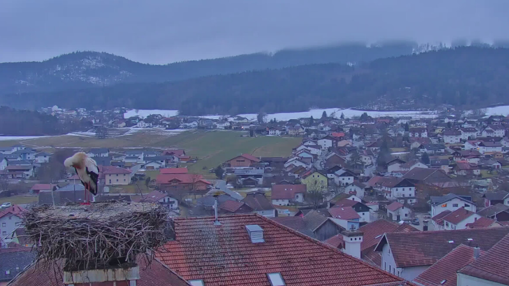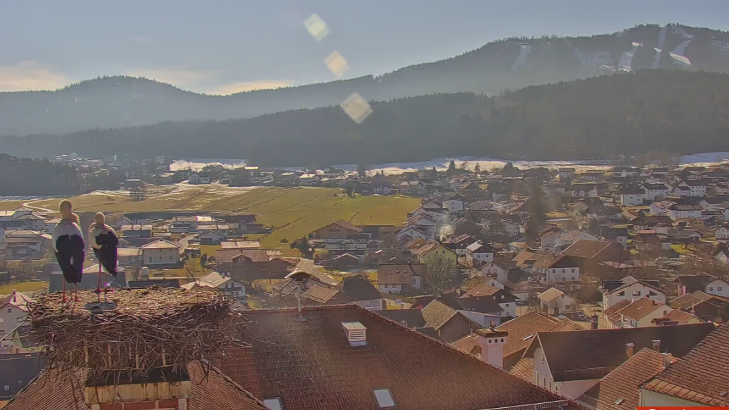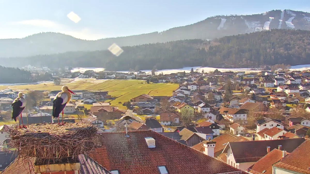 Čápi na hnízdě mají výhled na zasněženou sjezdovku lyžařského areálu Hohen Bogen